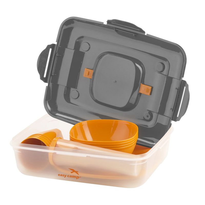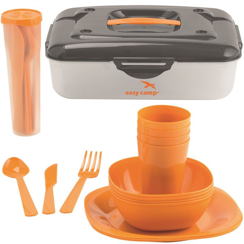 Η Easy Camp δημιούργησε ένα μοναδικό σετ 24 τεμαχίων, ιδανικό για το πικ νικ στην εξοχή, τις εκδρομές ή το camping! Το σετ αποτελείται από πιάτα, ποτήρια, μπολ, πιρούνια, μαχαίρια, κουτάλια, όπως επίσης και ένα τάπερ που αποθηκεύονται όλα μέσα και διαθέτει λαβή μεταφοράς. Με μικρό μέγεθος συσκευασίας και ελάχιστο βάρος είναι εξαιρετική επιλογή για τις μετακινήσεις σας! Με δυνατότητα για πλύσιμο στο πλυντήριο πιάτων, καθαρίζεται εύκολα και είναι ένα κομψό και όμορφο σετ σε εντυπωσιακό πορτοκαλί χρώμα, κατάλληλο για χρήση από όλα τα μέλη της οικογένειας! Επίσης, μπορεί να διατηρήσει φρούτα, λαχανικά κλπ. με μια παγοκύστη 800 ml της Outwell (δεν περιλαμβάνεται) ώστε να είναι φρέσκα και δροσερά, για περίπου 10 ώρες!