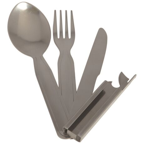 Πτυσσόμενα μαχαιροπίρουνα με την υπογραφή της κορυφαίας εταιρείας Mil-Tec, ιδανικό αξεσουάρ για να απολαύσετε το γεύμα σας στην ύπαιθρο! Είναι κατασκευασμένο από ανοξείδωτο ατσάλι υψηλής ποιότητας που το καθιστά εξαιρετικά ανθεκτικό και δεν μαυρίζει. Χάρη στον πτυσσόμενο σχεδιασμό του καταλαμβάνει πολύ λίγο χώρο και δεν έχει αιχμηρά στοιχεία ή άκρα που θα μπορούσαν να βλάψουν το σακίδιο ή τον υπόλοιπο εξοπλισμό σας. Αποτελείται από 4 στοιχεία: Aνοιχτήρι κονσέρβας, Ανοιχτήρι μπουκαλιών, Οδοντωτό μαχαίρι, Πιρούνι, Κουτάλι και είναι ιδανικό για camping, τουρίστες, για υπαίθριες δραστηριότητες, ακόμη και στο γραφείο!