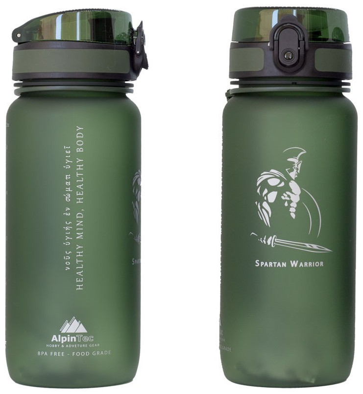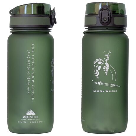 Παγούρι 650ml της AlpinTec σκούρο πράσινο με εικόνα μαχητή και επιγραφή στα Αρχαία ελληνικά! Ιδανικό αξεσουάρ για να σας συντροφεύει σε όλες σας τις δραστηριότητες όπως επίσης και σε ταξίδια μεγάλης διάρκειας, εξασφαλίζοντας την ενυδάτωση σας καθόλη την διάρκεια τους! Με βάρος μόλις 0,19 kg χωράει άνετα στο σακίδιο σας! Είναι κατασκευασμένο από υλικά τελευταίας τεχνολογίας , ανθεκτικά στην φθορά, ενώ η επένδυση της επιφάνειας με αμμοβολή διατηρεί το παγούρι σας πάντα σαν καινούργιο στην αρχική του κατάσταση! Η μοναδική υφή της επίστρωσης χαρίζει στο παγούρι απαλή και βελούδινη αίσθηση. Διαθέτει λουράκι καρπού κατασκευασμένο από μεταξένιο υλικό, αποτρέποντας πιθανούς τραυματισμούς στον καρπό σας, και για εύκολη μεταφορά του όπου εσείς επιθυμείτε. Το άνοιγμα του είναι αρκετά μεγάλο ώστε να ταιριάζει σε κάθε καρπό! Το καπάκι του παγουριού διαθέτει ένα πλατύ στόμιο που παρέχει γρήγορη και ανεμπόδιστη ροή. Ο αεραγωγός που βρίσκεται στο πάνω μέρος βοηθάει έτσι ώστε η ροή του υγρού να είναι αβίαστη χωρίς να χρειάζεται αναρρόφηση. Το καπάκι από σιλικόνη προσφέρει στεγανότητα και διατηρεί το στόμιο καθαρό! O διακόπτης ασφαλείας στο καπάκι είναι έξυπνα ενσωματωμένος στη σχεδίαση του μπουκαλιού και σας προφυλάσσει από το ενδεχόμενο διαρροών. Ασφαλίζει το καπάκι αποτελεσματικά καθιστώντας αδύνατο ένα τυχαίο άνοιγμα του μέσα στην τσάντα. Ο διακόπτης βρίσκεται γύρω από το κουμπί OPEN. Απλά απενεργοποιήστε το διακόπτη και πατήστε το κουμπί για να ανοίξει το καπάκι και να πιείτε. Είναι κατάλληλο για ζεστά και κρύα ροφήματα από -10°C έως 96°C. Συνίσταται το πλύσιμο στο χέρι, καθώς ο σχεδιασμός του είναι τέτοιος που κάνει την διαδικασία πολύ πιο εύκολη συγκριτικά με άλλα παγούρια!