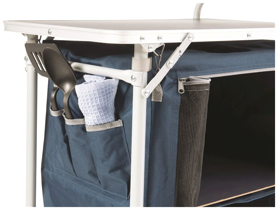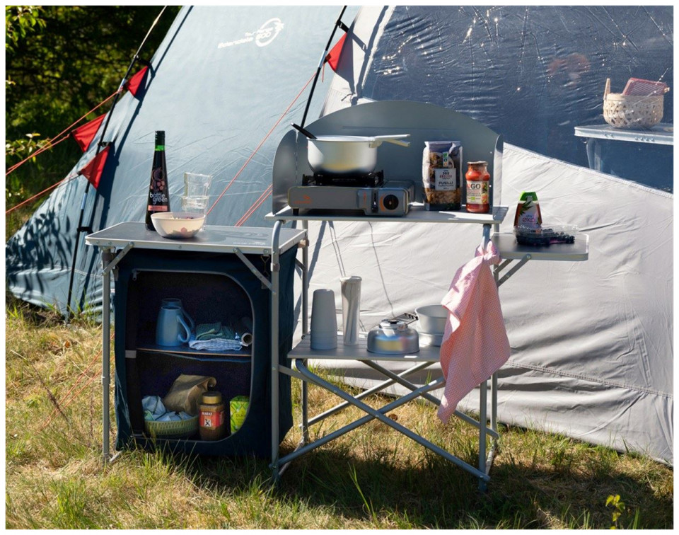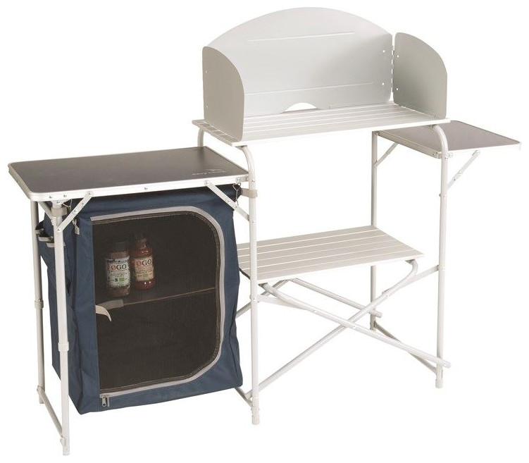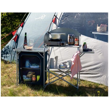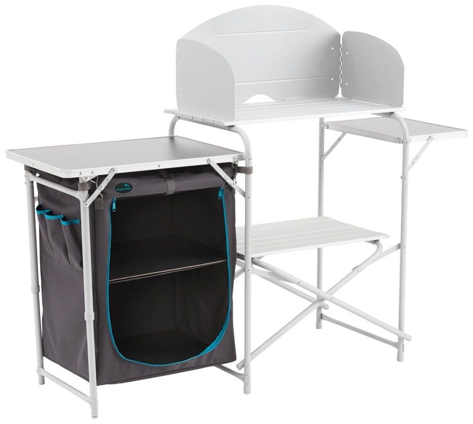 Τραπέζι Κουζίνας της Easy Camp Sarin με εργονομικό σχεδιασμό για να σας συντροφεύει με άνεση σε όλες τις υπαίθριες δραστηριότητες σας. Ιδανική επιλογή για την προετοιμασία και το ψήσιμο του γεύματος σας. Διαθέτει σταθερό ατσάλινο σκελετό, βοηθητικό τραπέζι, ράφι, και ντουλάπι με ράφι. Διαθέτει 2 κλειστά ράφια με διχτυωτή πόρτα για αερισμό, και σας δίνει την δυνατότητα αποθήκευσης των αξεσουάρ για την κουζίνα σας. Δυνατότητα Αναδίπλωσης και τοποθέτησης του τραπεζιού στην τσάντα μεταφοράς, η οποία περιλαμβάνεται, για την εύκολη μεταφορά και αποθήκευση του τραπεζιού χωρίς να δεσμεύει χώρο.