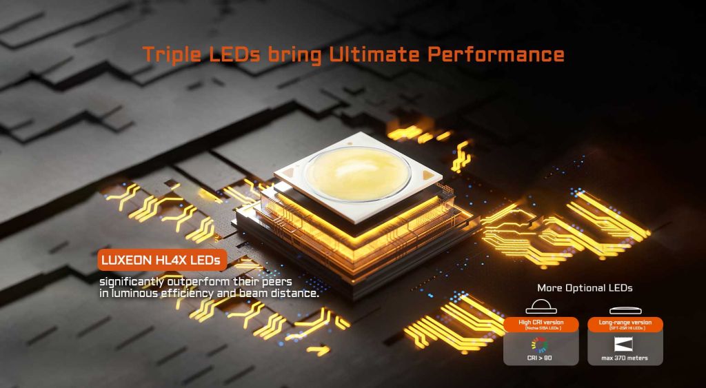- LEDs Nichia 519A CRI > 90: μέγιστη ένταση 1.900 lumens, εμβέλεια έως 270 μέτρα