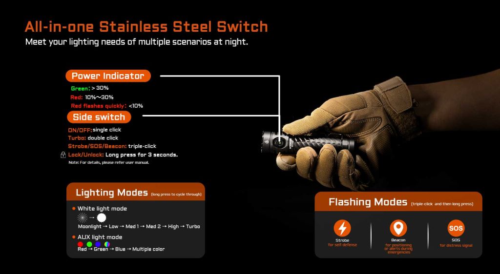 - 6 επίπεδα λευκής φωτεινότητας, καθώς και λειτουργίες Strobe, SOS και Beacon