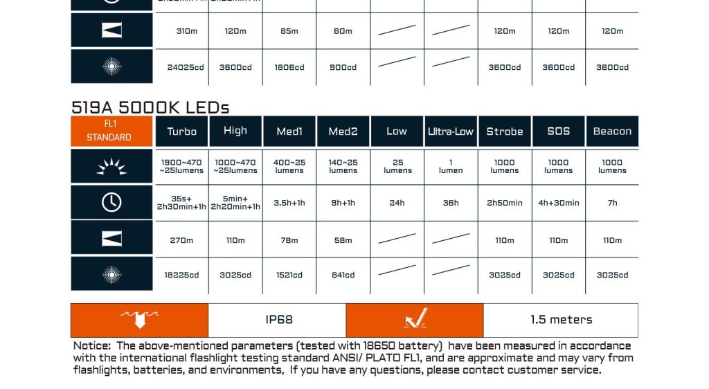 - SOS: 1300 lumens — 3025cd — 110 μέτρα — 4h30min