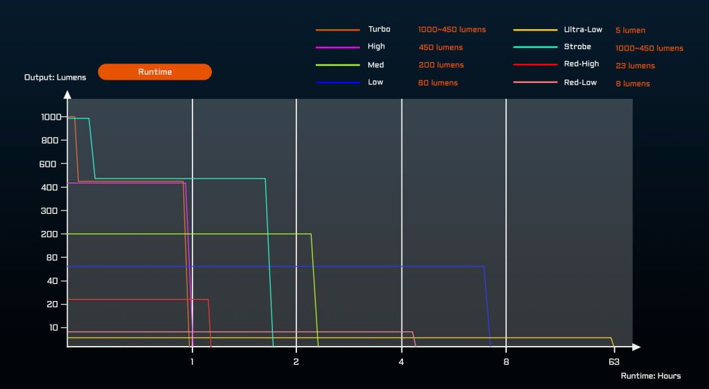 - Turbo: 1000 → 450 lumens — 12100cd — 220 μέτρα — 2 λεπτά + 54 λεπτά