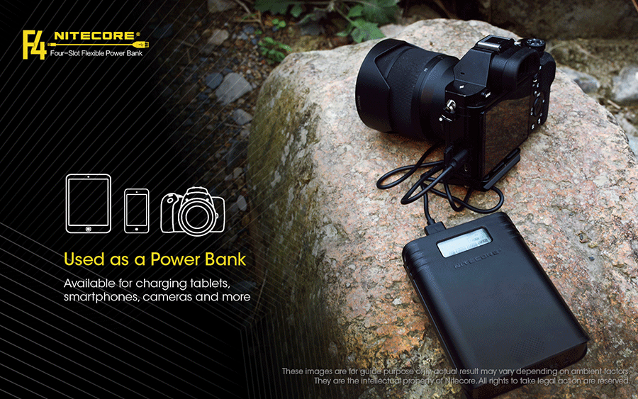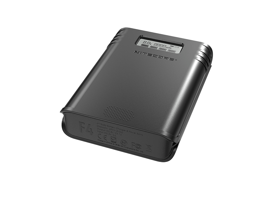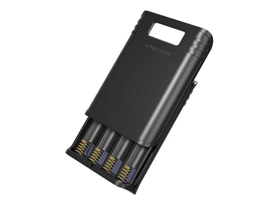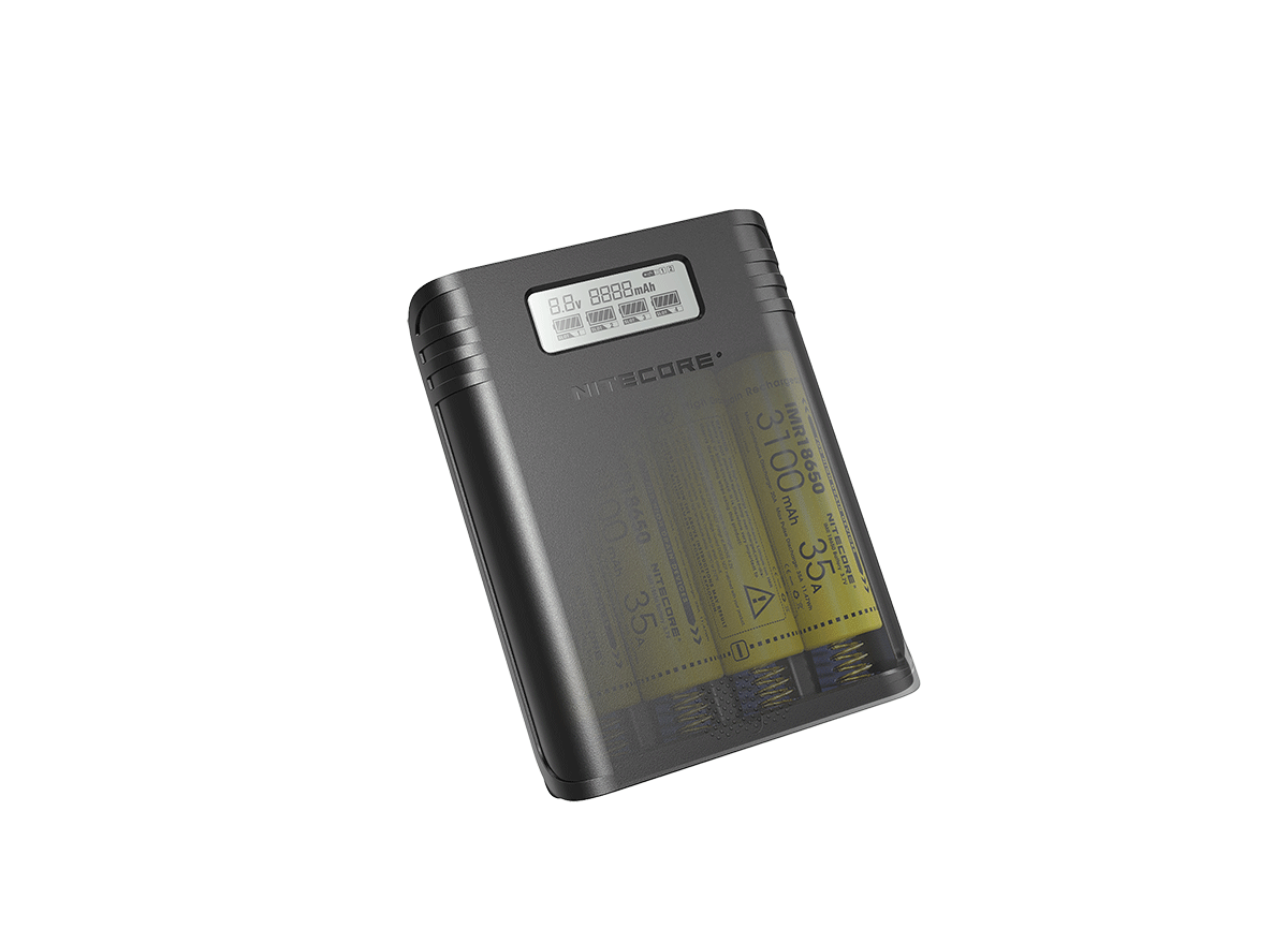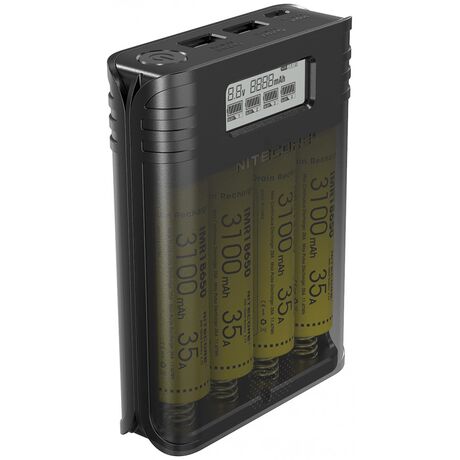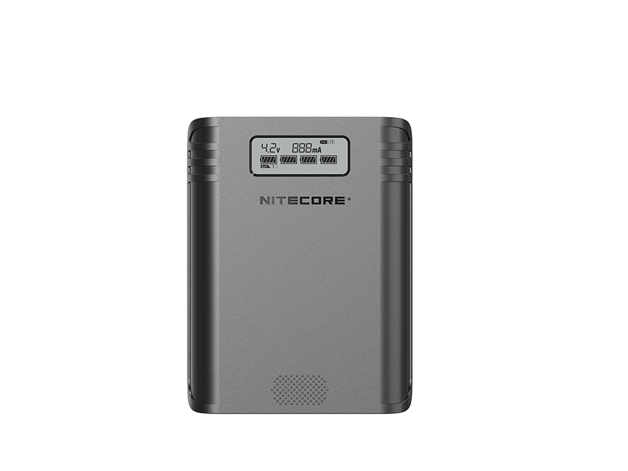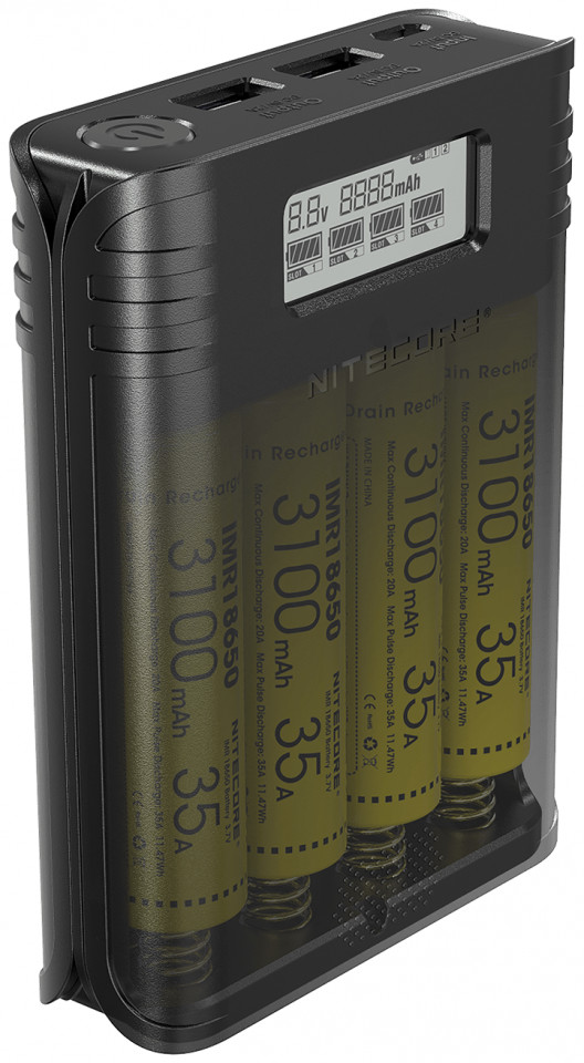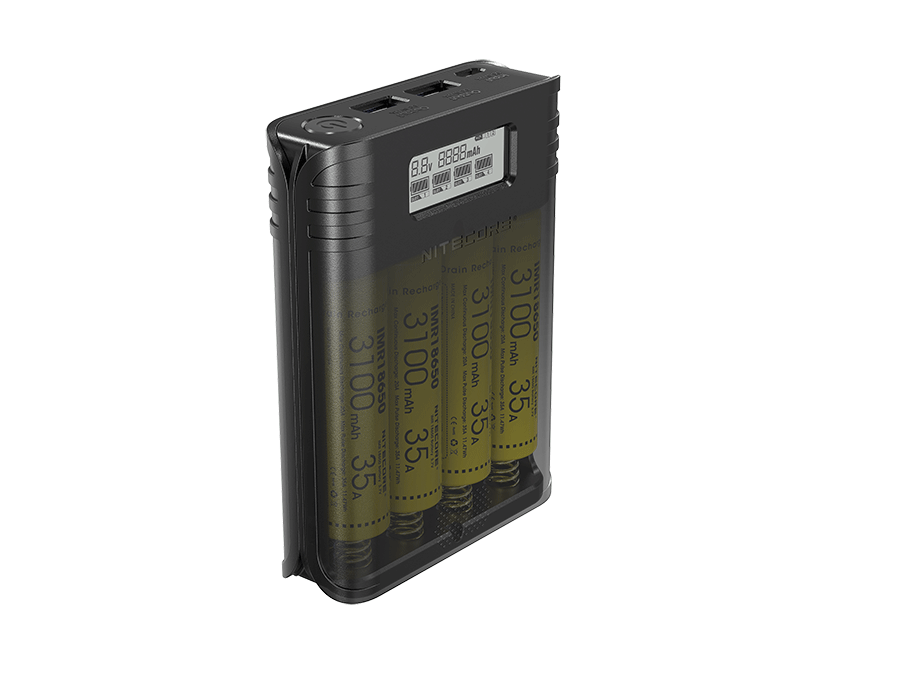 ΄Ενας ευέλικτος φορτιστής-powerbank από τη Nitecore,διαθέτει τέσσερις θέσεις φόρτισης και η τροφοδοσία γίνεται από θύρες USB.Η κάθε μία θέση φόρτισης ελέγχεται ανεξάρτητα με το έξυπνο σύστημα διαχείρισης της φόρτισης και εκφόρτισης.Φορτίζει μπαταρίες Li-ion του τύπου 18650.Έχει την δυνατότητα να τροφοδοτήσει μία συσκευή από την θύρα USB με ρεύμα έως και 2Α.Σε 2ώρες μπορεί να φορτίσει πλήρως ένα iPhone X.Ιδανικός για να χρησιμοποιείται ως Power Bank σε συσκευές Tablet, Smartphones, Φωτογραφικές μηχανές.Η οθόνη υγρών κρυστάλλων (LCD) παρέχει πληροφορίες σε πραγματικό χρόνο για τον έλεγχο της κατάστασης των μπαταριών.