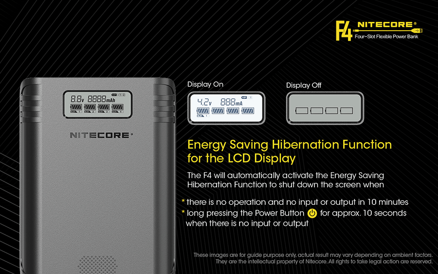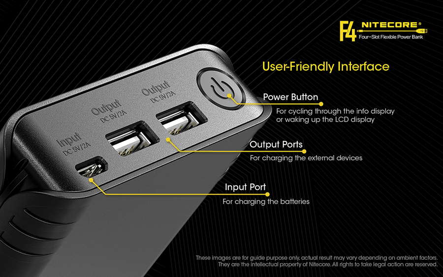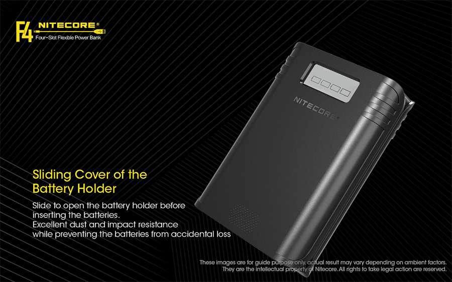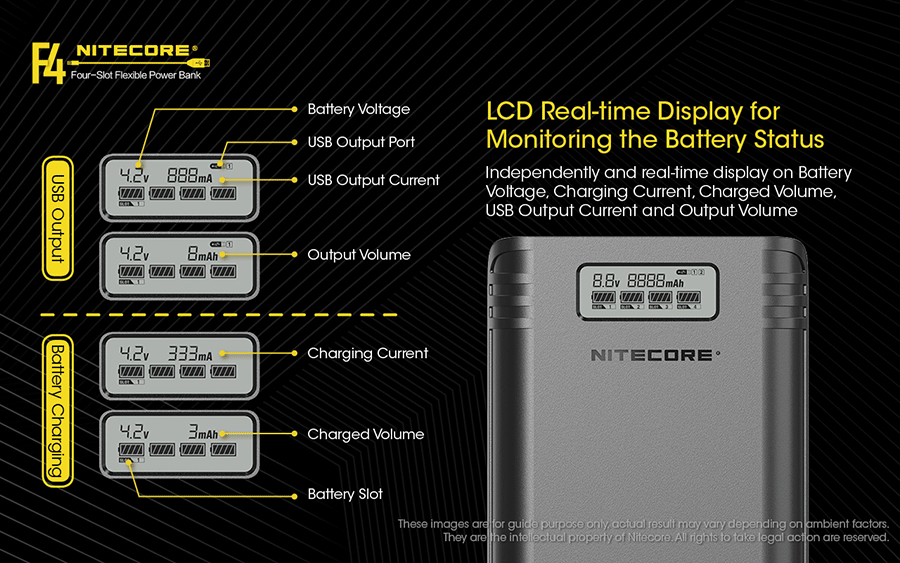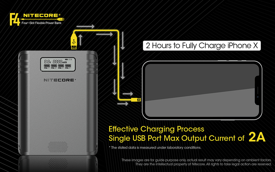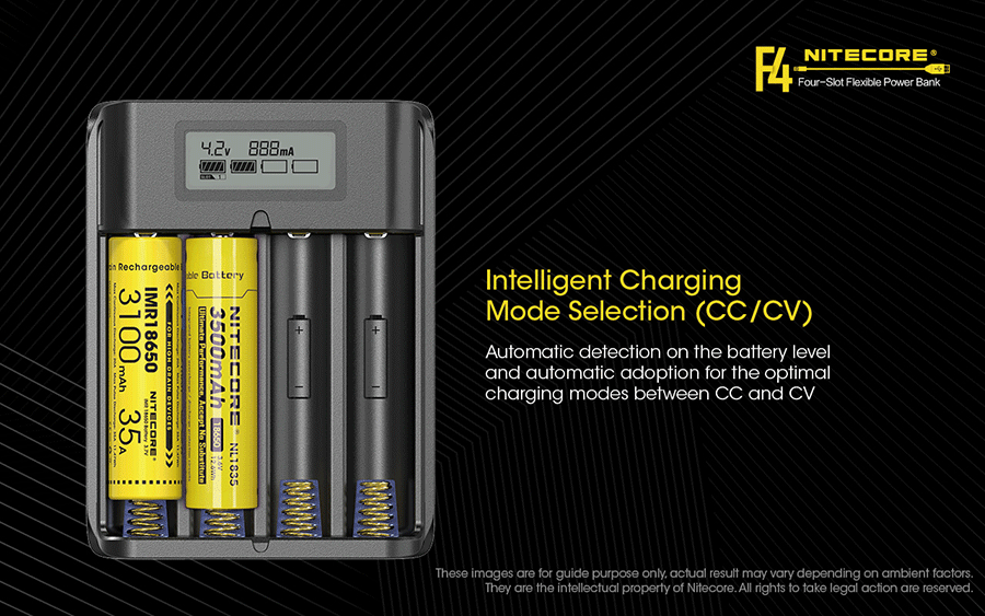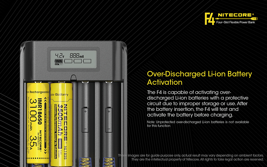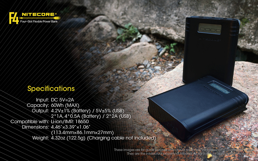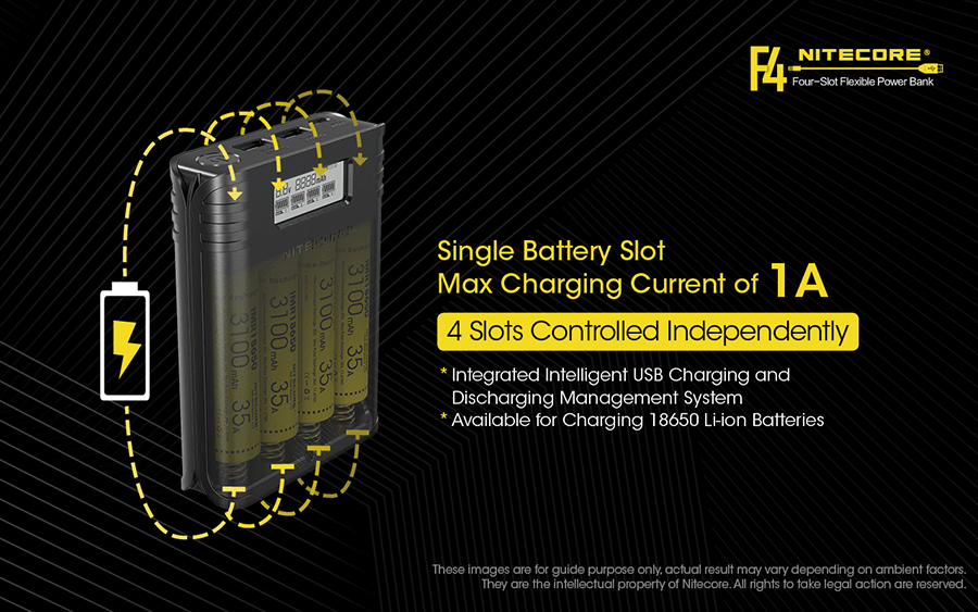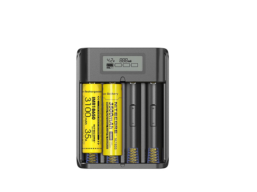 ΄Ενας ευέλικτος φορτιστής-powerbank από τη Nitecore,διαθέτει τέσσερις θέσεις φόρτισης και η τροφοδοσία γίνεται από θύρες USB.Η κάθε μία θέση φόρτισης ελέγχεται ανεξάρτητα με το έξυπνο σύστημα διαχείρισης της φόρτισης και εκφόρτισης.Φορτίζει μπαταρίες Li-ion του τύπου 18650.Έχει την δυνατότητα να τροφοδοτήσει μία συσκευή από την θύρα USB με ρεύμα έως και 2Α.Σε 2ώρες μπορεί να φορτίσει πλήρως ένα iPhone X.Ιδανικός για να χρησιμοποιείται ως Power Bank σε συσκευές Tablet, Smartphones, Φωτογραφικές μηχανές.Η οθόνη υγρών κρυστάλλων (LCD) παρέχει πληροφορίες σε πραγματικό χρόνο για τον έλεγχο της κατάστασης των μπαταριών.