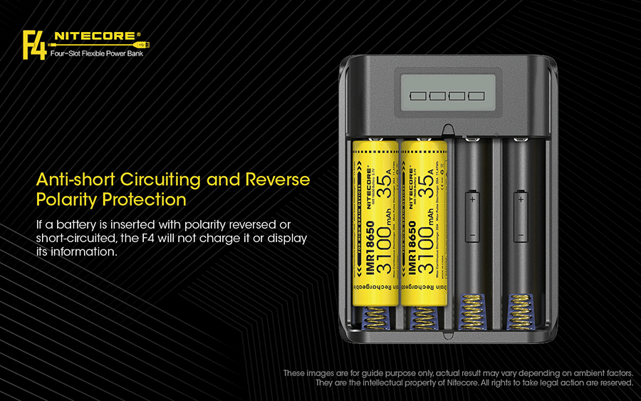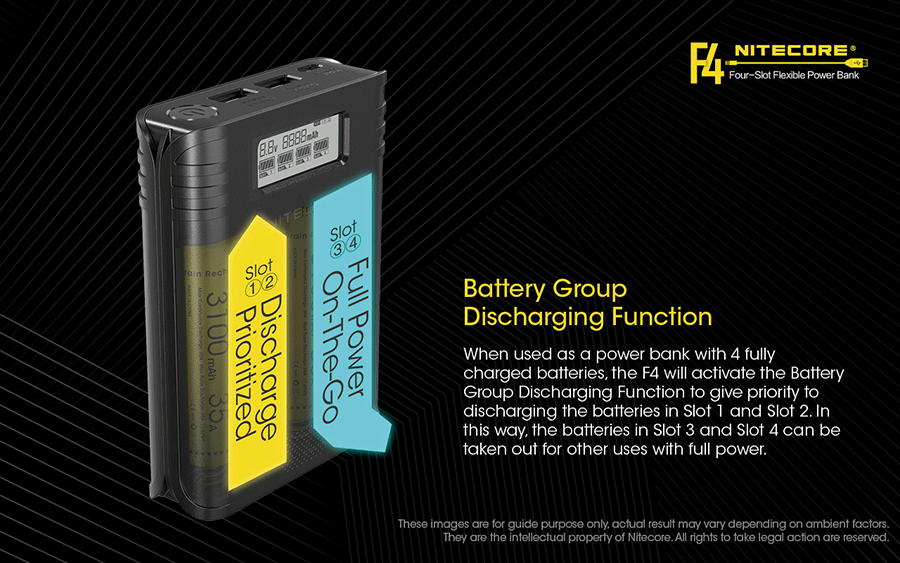 • Ως Power Bank με 4 πλήρως φορτισμένες μπαταρίες ο F4 θα ενεργοποιήσει την λειτουργία αποφόρτισης σε ομάδες και θα δώσει προτεραιότητα για την αποφόρτιση πρώτα των μπαταριών στις θέσεις 1 και 2 . Με αυτόν τον τρόπο, οι μπαταρίες στις θέσεις 3 και 4 μπορεί να χρησιμοποιηθούν για άλλες χρήσεις με διατηρημένη την πλήρη φόρτισης τους.