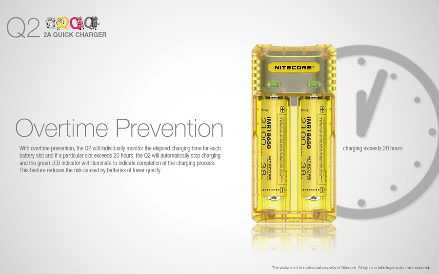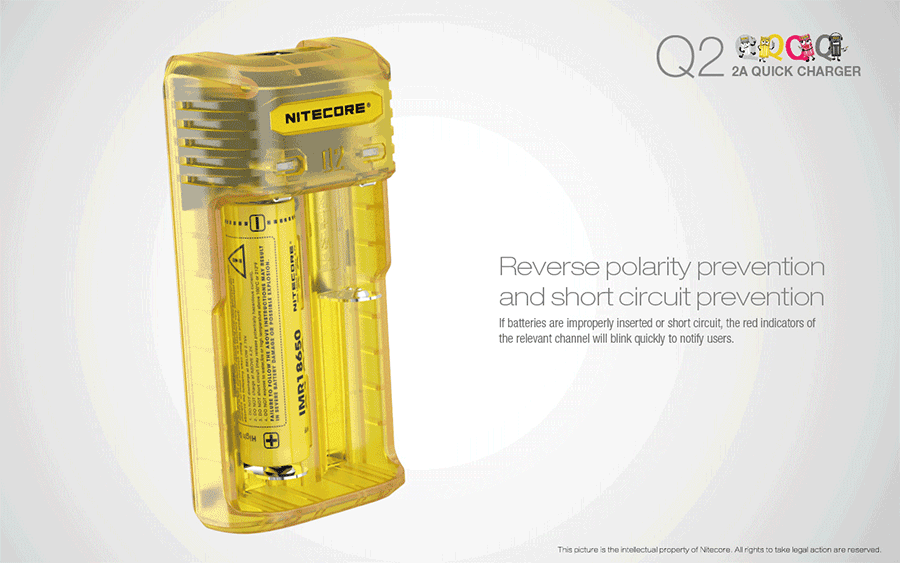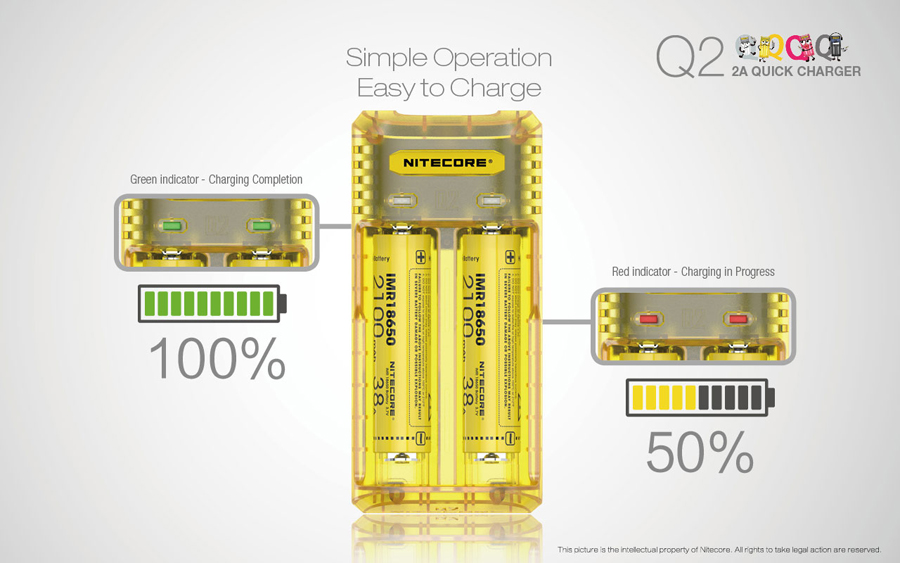 Καινούριος φορτιστής NITECORE της όμορφης σειράς "Q" με ρεύμα φόρτισης έως και 2000mA σε μία θέση φόρτισης. Ο Q2 έχει μία επαναστατική λειτουργία φόρτισης για μπαταρίες IMR και φορτίζει 2 μπαταρίες Li-ion ανεξάρτητα.Μέγιστο ρεύμα φόρτισης έως και 2000mA, φορτίζει 2 μπαταρίες Li-ion ταυτόχρονα και μέχρι 1000mA σε κάθε θέση φόρτισης.Επαναστατική αναβάθμιση για μπαταρίες IMR, ο Q2 ενσωματώνει ένα βελτιωμένο σύστημα φόρτισης για μπαταρίες IMR που είναι ικανό να ελέγχει όλη την διαδικασία φόρτισης, εξασφαλίζοντας ότι το τελικό ρεύμα είναι πάντα σε ασφαλή όρια που βοηθά τα μέγιστα στην παράταση της διάρκειας ζωής των μπαταριών.Μοναδικός καινοτόμος, όμορφος σχεδιασμός σε 4 χρώματα, μικρό μέγεθος εύκολο στη μεταφορά, δυνατότητα φόρτισης από το αυτοκίνητο. Η τεχνολογία ενεργής διανομής του ρεύματος "ACD" επιτρέπει τον Q2 να διανέμει ενεργά όλη την ενέργεια ανάμεσα στις δύο θέσεις φόρτισης με τρόπο προτεραιότητας. Ο Q2 θα μοιράσει το ρεύμα φόρτισης αυτόματα σύμφωνα με την κατάσταση φόρτισης. Πράσινες ενδεικτικές λυχνίες καταδεικνύουν την ολοκλήρωση της φόρτισης, κόκκινες ενδεικτικές λυχνίες καταδεικνύουν ότι η διαδικασία της φόρτισης είναι σε εξέλιξη. Ο Q2 αυτόματα ανιχνεύει και αναγνωρίζει την κατάσταση της μπαταρίας και προσαρμόζει την βέλτιστη λειτουργίας φόρτισης.Ο Q2 διαθέτει προστασία από ανάποδη πολικότητα και προστασία από βραχυκύκλωμα. Επίσης ο Q2 έχει την ικανότητα να ενεργοποιεί εξαντλημένες μπαταρίες Li-ion με κύκλωμα προστασίας. Μετά την τοποθέτηση τους ο Q2 αυτόματα θα τις ελέγξει και θα τις ενεργοποιήσει και μετά θα τις φορτίσει. Με την προστασία από υπερβολική φόρτιση ο Q2 ελέγχει ανεξάρτητα κάθε θέση φόρτισης σε σχέση με τον χρόνο και σταματά την φόρτιση όταν αυτή ξεπεράσει τις 20 ώρες.Τα πολυκαρβρονικά υλικά κατασκευής είναι ασφαλή, επιβραδυντικά της φλόγας, ανθεκτικά στην φωτιά.Κάθε γνήσιος φορτιστής NITECORE διαθέτει στην συσκευασία του μοναδικό 16ψήφιο κωδικό που εξασφαλίζει την αυθεντικότητα του.
