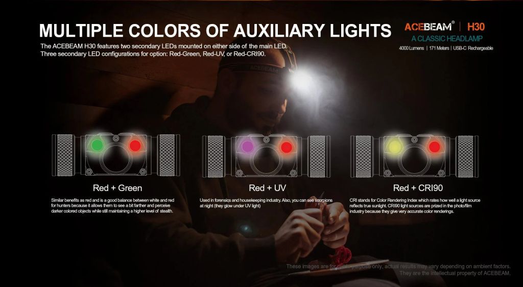 Η AceBeam παρουσιάζει τον εξαιρετικά ισχυρό φακό-κεφαλής H30 R+G, σχεδιασμένο για απαιτητικές εξορμήσεις στην ύπαιθρο, καθώς και για επαγγελματική χρήση σε σκληρές συνθήκες. Χάρη στην πολύ υψηλή απόδοση λευκού φωτός έως 4.000 lumen, σε συνδυασμό με τα δευτερεύον κόκκινα και πράσινα LED λυχνίες, αποτελεί ένα ολοκληρωμένο εργαλείο φωτισμού για δραστηριότητες όπως κυνήγι, ψάρεμα, νυχτερινή παρατήρηση ή εξωτερικές εργασίες όπου απαιτείται ειδικός φωτισμός.