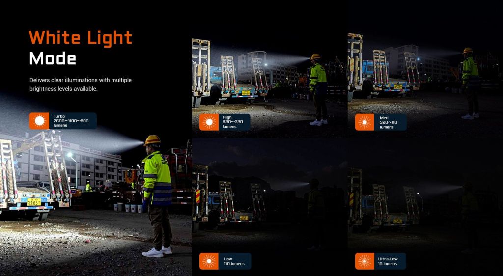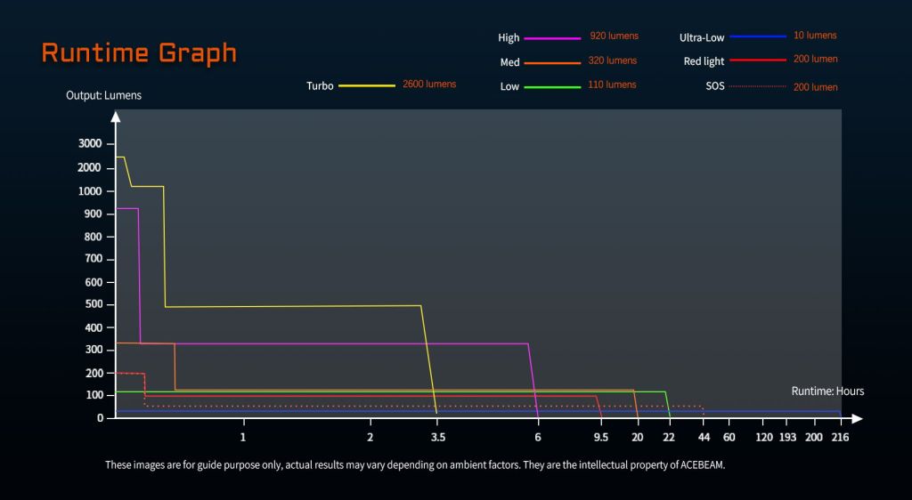 -Turbo: 2600 → 1100 → 500 lumens
