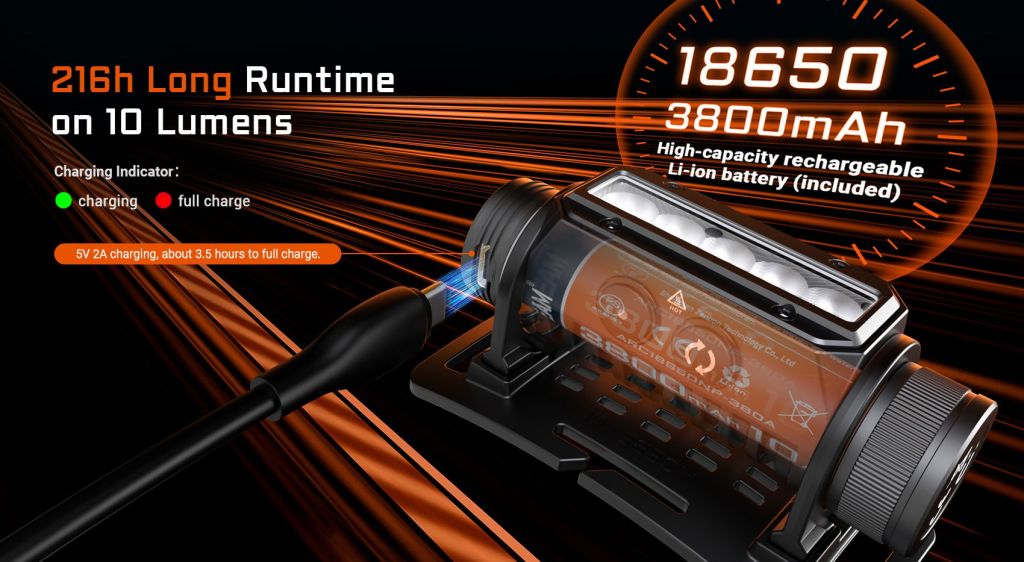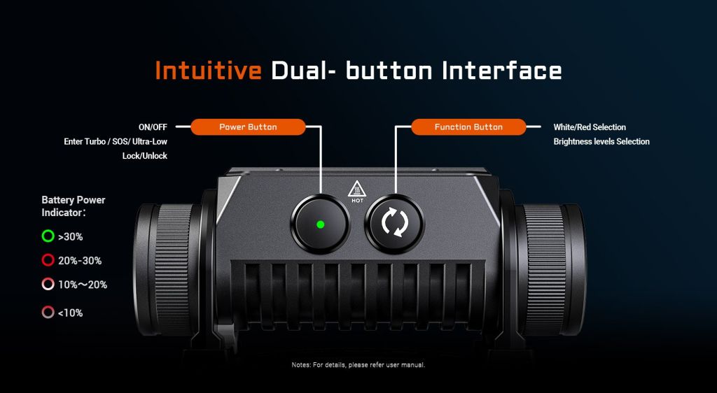 - Κόκκινο φως: μέγιστη ένταση 200 lumens με εμβέλεια έως 63 μέτρα — ιδανικό για κυνήγι και διατήρηση νυχτερινής όρασης