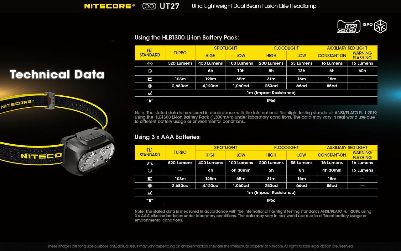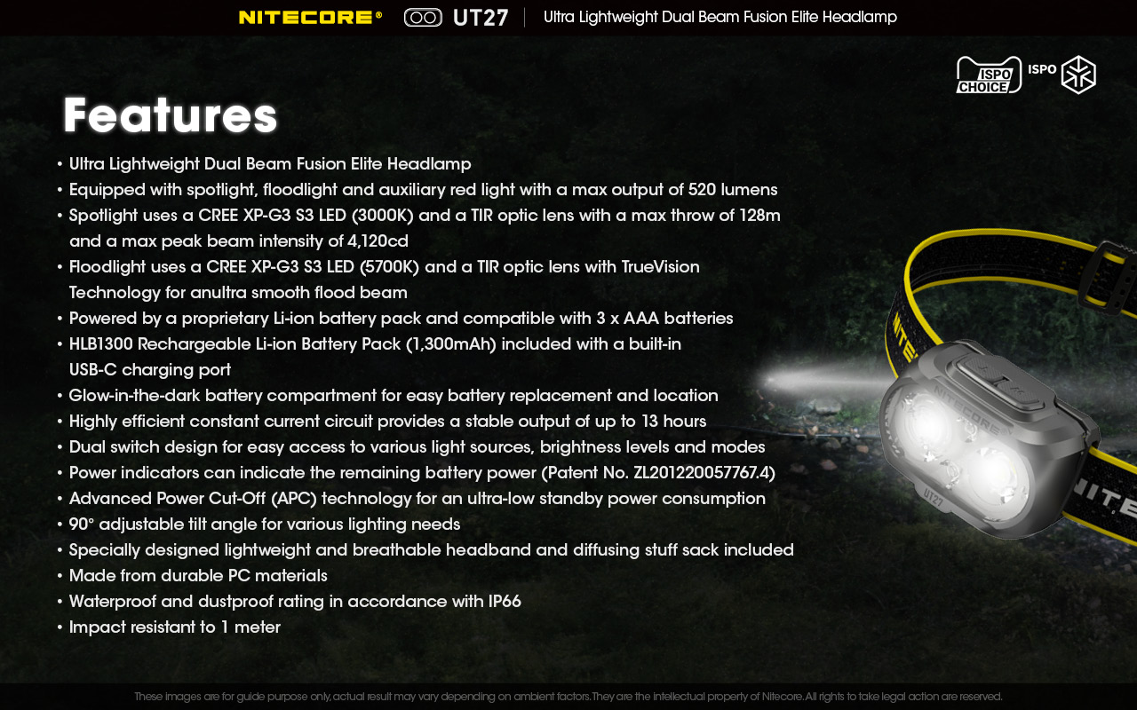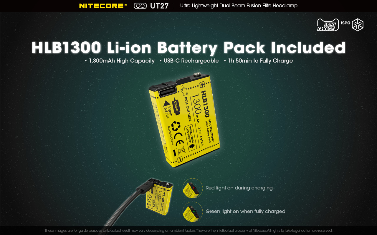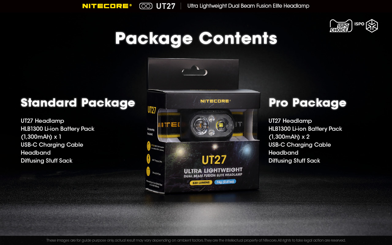 •  Περιεχόμενα συσκευασίας (Πακέτο PRO) - Φακός NITECORE UT27 - Δύο (2) επαναφορτιζόμενες μπαταρίες ιόντων λιθίου Li-ion HLB1300 με χωρητικότητα 1300mAh η κάθε μία, Καλώδιο φόρτισης USB-C - Ιμάντας κεφαλής - Ημιδιάφανος σάκος