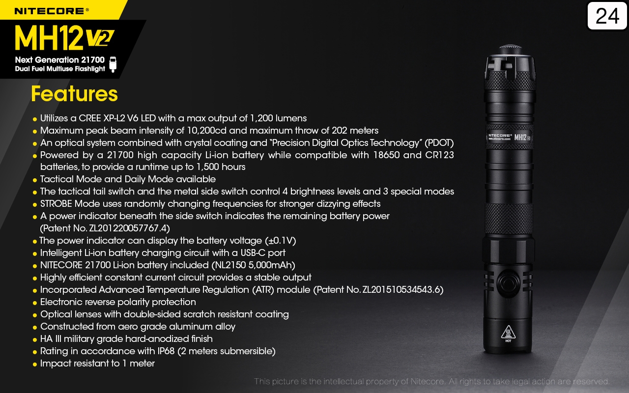 Ένας από τους πιο κλασικούς και πολυχρησιμοποιημένους φακούς, εξελίσσεται στην πορεία των χρόνων για να προσφέρει στους χρήστες την καλύτερη εμπειρία χρήσης. Εξελιγμένος φακός LED NITECORE νέας γενιάς για χρήση τόσο μπαταριών 21700 όσο και μπαταριών 18650, CR123, RCR123 ώστε ο χρήστης να μπορεί να επιλέγει την τροφοδοσία κατά περίπτωση.Είναι εφοδιασμένος με ένα πανίσχυρο LED CREE XP-L2 V6 με ικανότητα χρήσης για τουλάχιστον 50000 ώρες λειτουργίας που σε συνδυασμός με το οπτικό σύστημα (καθρέπτης) που είναι κατασκευασμένο με τον συνδυασμό της τεχνολογίας "Κρυστάλλινης Επίστρωσης" και της τεχνολογίας "Ψηφιακών Οπτικών Ακριβείας" (PDOT) είναι ικανός να εκπέμψει δέσμη με ένταση 10200 κεριών και να φθάσει την απόσταση των 202 μέτρων καθιστώντας τον ιδανικό για καταστάσεις έκτακτης ανάγκης, αυτοάμυνα, δραστηριότητες στην φύση, ελέγχους συντήρησης, περιπολίες, σώματα ασφαλείας κ.α.Οι μπαταρίες 21700 νέας γενιάς χαρακτηρίζονται από την μεγάλη διάρκεια ζωής, την μεγάλη ενεργειακή πυκνότητα και την πανίσχυρη απόδοση. Οι μπαταρίες 21700 πρωτοεμφανίστηκαν στην βιομηχανία των ηλεκτροκίνητων αυτοκινήτων και θεωρούνται ότι θα είναι το μέλλον στις κυλινδρικές μπαταρίες. Είναι συμβατός και με άλλα μεγέθη μπαταριών. Η χρήση του συστήνεται να γίνεται με μπαταρίες 21700 αλλά ταυτόχρονα είναι συμβατός και με μπαταρίες 18650 αλλά και με CR123 / RCR123 x 2 με την χρήση ειδικού αντάπτορα που περιλαμβάνεται στην συσκευασία.Πάντα έτοιμος τόσο για στιγμιαίο φωτισμό όσο και για τον μόνιμο φωτισμό. Ο φιλικός προς τον χρήστη πλάγιος μεταλλικός διακόπτης είναι ανθεκτικός και παρέχει καλύτερη ανταπόκριση στον χρήστη ακόμη και όταν αυτός φοράει γάντια.Στον καθημερινό τρόπο λειτουργίας διαθέσιμες φωτεινότητες είναι οι εξής : High, Mid, Low, Ultralow, Strobe, Beacon, SOS.Στον επιχειρησιακό τρόπο λειτουργίας οι διαθέσιμες φωτεινότητες είναι οι εξής: High, Mid, Low, Ultralow, Strobe.Ο προεπιλεγμένος τρόπος λειτουργίας είναι ο καθημερινός. Η εναλλαγή ανάμεσα στον καθημερινό και στον επιχειρησιακό τρόπο λειτουργίας γίνεται πολύ εύκολα με το συνδυαστικό πάτημα και των δύο διακοπτών(Λεπτομέρειες στις οδηγίες χρήσεως).O NTR10 είναι ένας επαγγελματικός επιχειρησιακός δακτύλιος που επιτρέπει έναν μοναδικό και ευέλικτο τρόπο χρήσης του φακού.Μπορεί να προσαρμοστεί σε μία από τις τρεις ειδικές για αυτόν τον σκοπό , αυλακώσεις στο σώμα του φακού.Ο ειδικός φωτισμός STROBE με την τυχαία εναλλαγή συχνότητας αναλαμπών, προσφέρει μεγαλύτερο αποτέλεσμα ζάλης καθώς η χρήση του σε γυμνά μάτια δεν επιτρέπει να το συνηθίσουν. Το εύρος της συχνότητας αναλαμπών είναι μεταξύ 16 και 20 Hz.Σε περιπτώσεις έκτακτης ανάγκης, Αυτοάμυνα με το STROBE, Εξωτερικές δραστηριότητες στην φύση, Ελέγχους ασφάλειας σε μηχανές κατά την συντήρησης, σε όλα τα σώματα ασφαλείας.Διαθέτει λειτουργία μνήμης και κάθε φορά που ενεργοποιείται ξανά, μεταβαίνει στο τελευταία χρησιμοποιούμενο επίπεδο φωτεινότητας ή στην ειδική φωτεινότητας STROBE (Για τις ειδικές φωτεινότητας SOS και BEACON δεν ισχύει η λειτουργία μνήμης).Στο εσωτερικό του υπάρχει μονάδα αυτόματης ρύθμισης της θερμοκρασίας που ρυθμίζει την ένταση της δέσμης σύμφωνα με τις συνθήκες λειτουργίας και με τις συνθήκες του γύρω περιβάλλοντος ώστε να διατηρείτε η μέγιστη απόδοση.Μία ενδεικτική λυχνία ισχύς κάτω από τον πλάγιο διακόπτη καταδεικνύει την ενέργεια που έχει απομείνει στην μπαταρία.