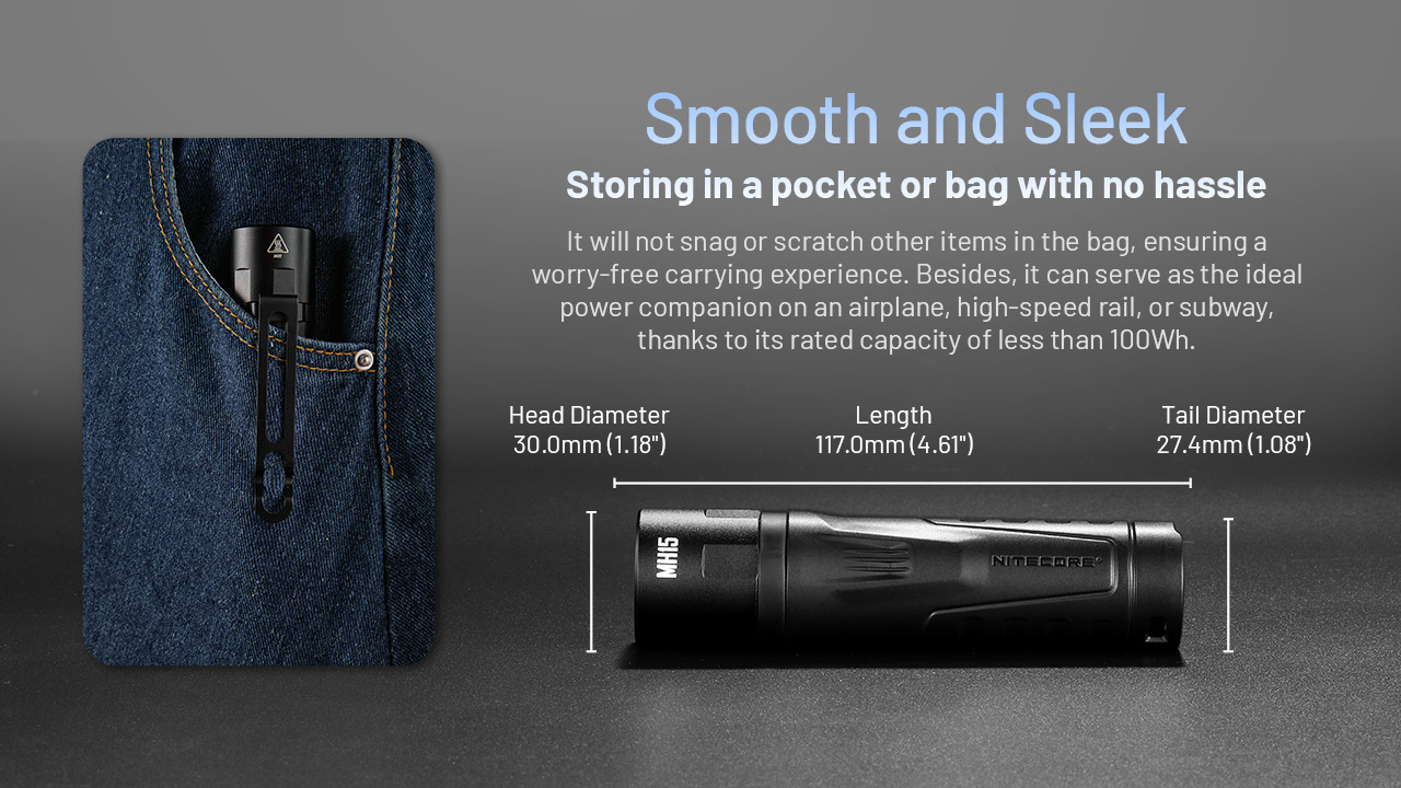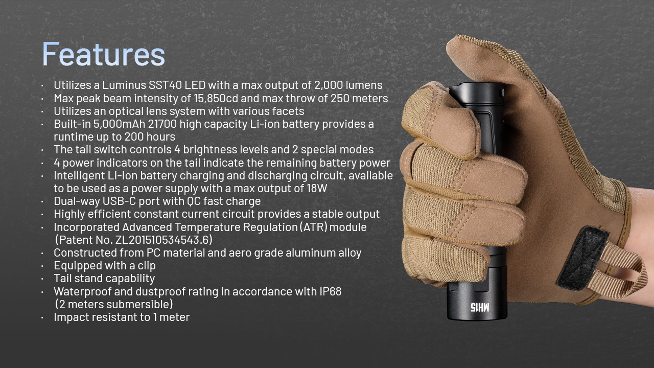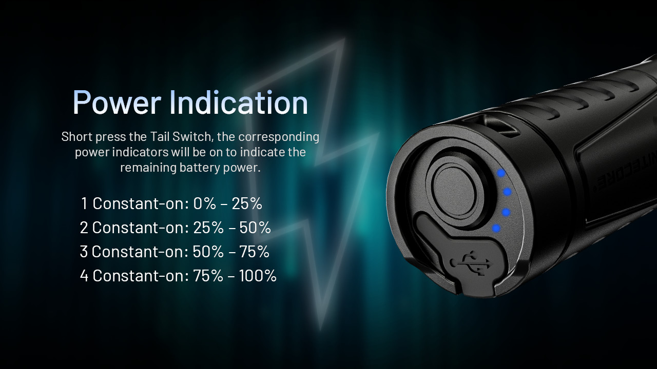 Εξαιρετικά ελαφρύς, μόλις 140 gr για να τον έχετε πάντα μαζί σας χωρίς να σας βαραίνει ή να σας κουράζει. Με κεφαλή κατασκευασμένη από κράμα αλουμινίου αεροναυπηγικής ποιότητας και πολυκαρβονικό υλικό (PC) καταφέρνει να διατηρεί την τέλεια ισορροπία απαγωγής θερμότητας και χαμηλού βάρους. Η ολοκληρωμένη τεχνoλογία ATR προσφέρει βέλτιστη απόδοση καθώς ρυθμίζει την έξοδο ανάλογα με τις εξωτερικές συνθήκες περιβάλλοντος. Το μικρό του μέγεθος και η ομαλή επιφάνειά του εξασφαλίζει εύκολη αποθήκευση και μεταφορά, διαθέτει μεταλλικό κλιπ ώστε να τον αναρτάται και να τον έχετε πάντα προσβάσιμο ενώ μπορεί να σταθεί όρθιος στην ουρά του. Οι ενδεικτικές λυχνίες στην ουρά σας υποδεικνύουν την εναπομείνουσα ισχύ της μπαταρίας με ένα σύντομο πάτημα του διακόπτη. Εξοπλισμένος με λειτουργία Beacon και SOS τον καθιστά ιδανικό για σήμανση έκτακτης ανάγκης την νύχτα κάνοντας τον εντοπισμό και την παροχή βοήθειας άμεσα.