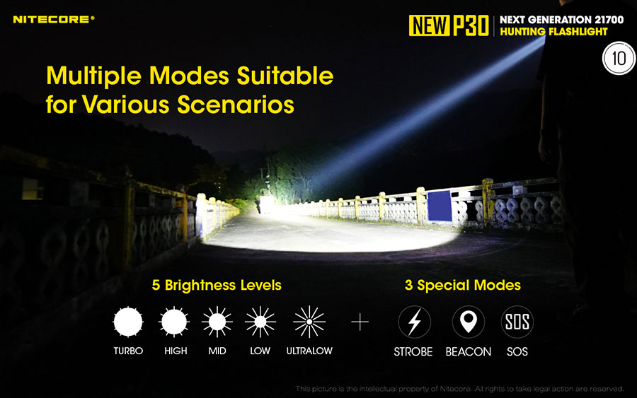 Εξαιρετικά μεγάλη απόσταση φωτισμού, συμπεριλαμβάνεται επαναφορτιζόμενη μπαταρία 217400/5000mAh (NL2150R) με ενσωματωμένη θύρα φόρτισης USB-C.Ο φακός είναι μικρού μεγέθους και χαμηλού βάρους, εύκολος στην μεταφορά και την χρήση του.Οι επαναφορτιζόμενες μπαταρίες ιόντων λιθίου 21700 χρησιμοποιούνται ευρέως σε συσκευές φωτισμού αλλά και άλλου είδους εξοπλισμό.Τα χαρακτηριστικά τους είναι η μεγάλη διάρκεια λειτουργίας, η υψηλή πυκνότητα ενέργειας και η πανίσχυρη απόδοση. Οι μπαταρίες 21700 πρωτοεμφανίστηκαν στην βιομηχανία κατασκευής αυτοκινήτων και θεωρούνται ότι θα είναι οι μελλοντικές κυλινδρικές μπαταρίες.Συστήνεται η χρήση του με μπαταρίες 21700 ενώ ταυτόχρονα είναι συμβατός με μπαταρίες 18650 και μπαταρίες CR123 / RCR123. Για την χρήση των μπαταριών 18650, CR123, RCR123 είναι απαραίτητη η χρήση της ειδικής θήκης που περιλαμβάνεται στην συσκευασίας.Με σταθερή χρήση στην πολύ χαμηλή φωτεινότητα μπορεί να λειτουργήσει εως και 40 ημέρες.Το LED CREE XP-L Hi V3 σε συνδυασμό με τον εξαιρετικό ανακλαστήρα που είναι κατασκευασμένος με την τεχνολογία Κρυστάλλινης Επίστρωσης και την τεχνολογία Ψηφιακών Οπτικών Ακριβείας (PDOT) παρέχει εξαιρετική απόδοση σε απόσταση καθιστώντας τον φακό ιδανικό για αναζήτηση και κυνήγι.Ο οπίσθιος διακόπτης ουράς είναι πάντα έτοιμος για επιχειρησιακή χρήση, προσφέρει λειτουργία στιγμιαίου φωτισμού. Ο πλάγιος διακόπτης επιλογών βοηθά στην επιλογή του επιπέδου φωτισμού και των ειδικών φωτισμών.Διαθέτει 5 επίπεδα φωτισμού : Πολύ Χαμηλό > Χαμηλό > Μεσαίο > Υψηλό > Turbo και 3 ειδικές φωτεινότητες: STROBE > BEACON > SOSΗ ενσωματωμένη μονάδα ελέγχου της θερμοκρασίας ρυθμίζει την ένταση του φωτισμού του NEW P30 σύμφωνα με τις συνθήκες λειτουργίας αλλά και του γύρω περιβάλλοντος έτσι ώστε να διατηρείται η μέγιστη απόδοση.Η ενδεικτική λυχνία κάτω από τον διακόπτη επιλογών αναφέρει την τάση της μπαταρίας με ακρίβεια ± 0,1V.