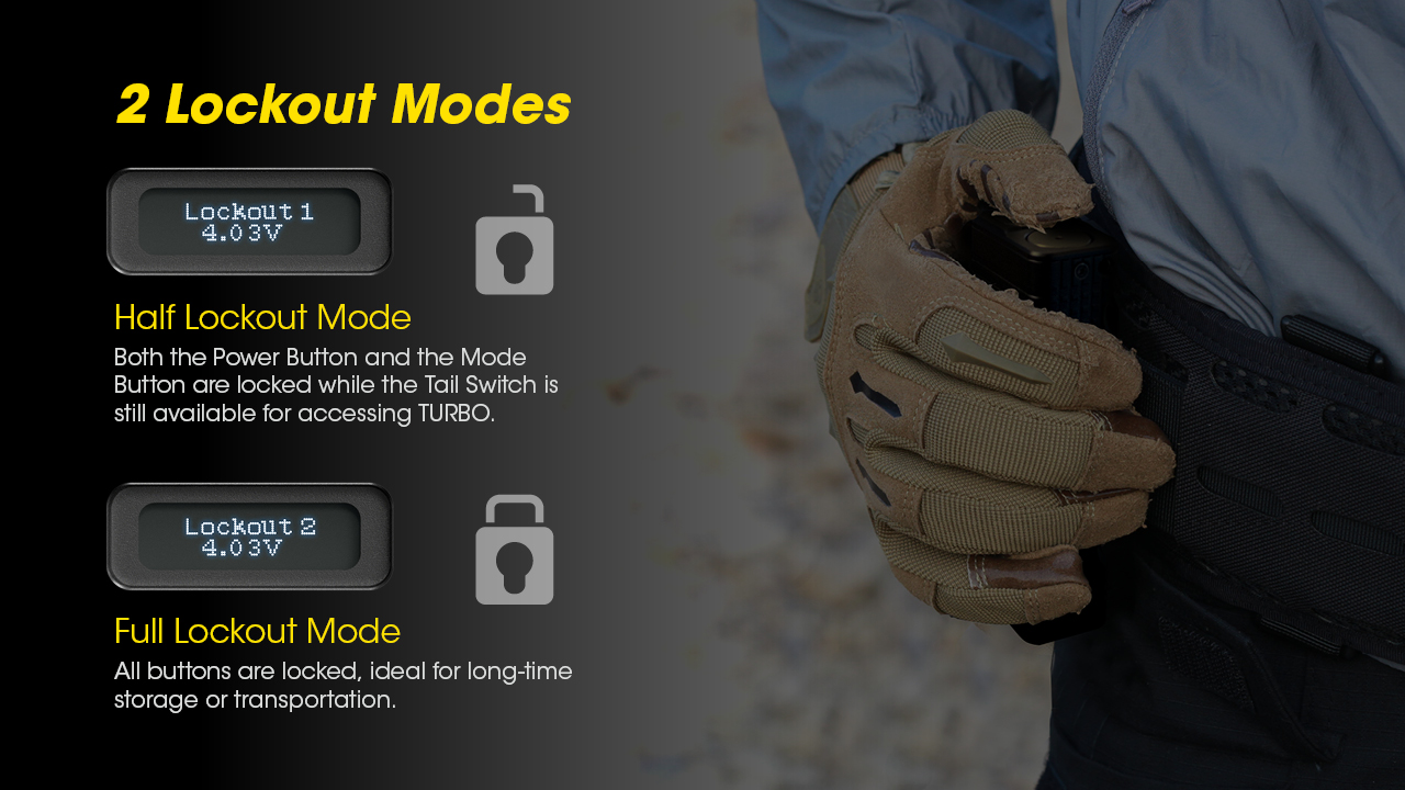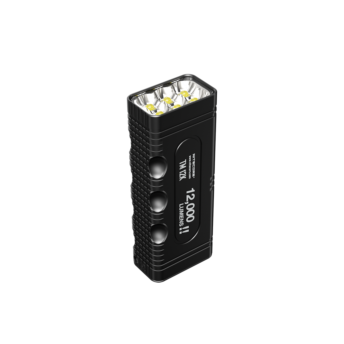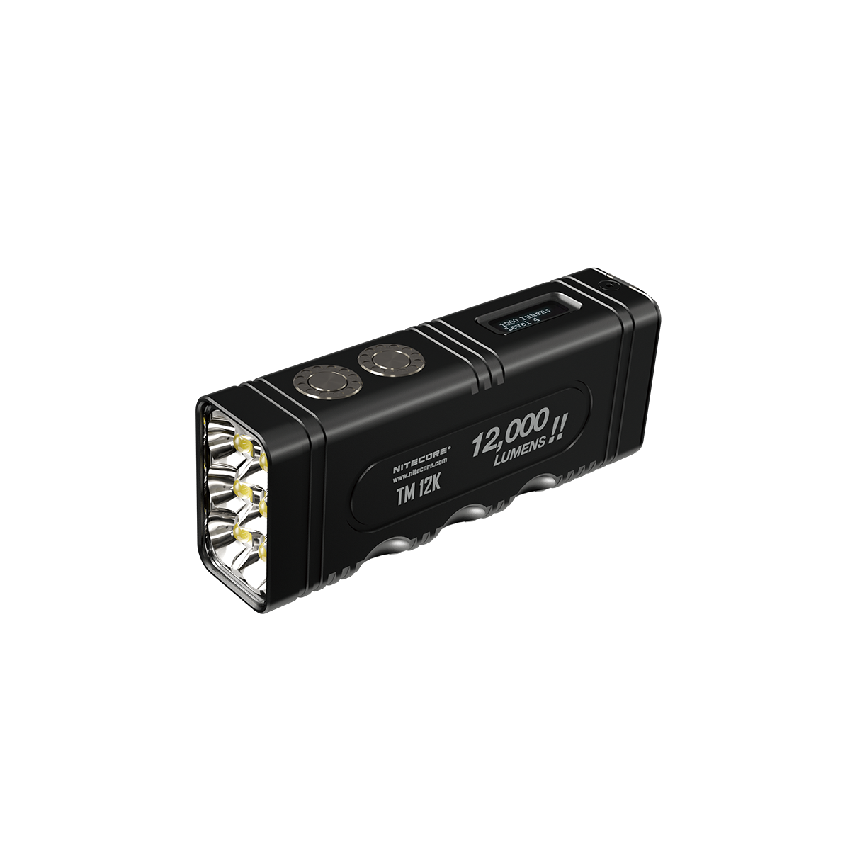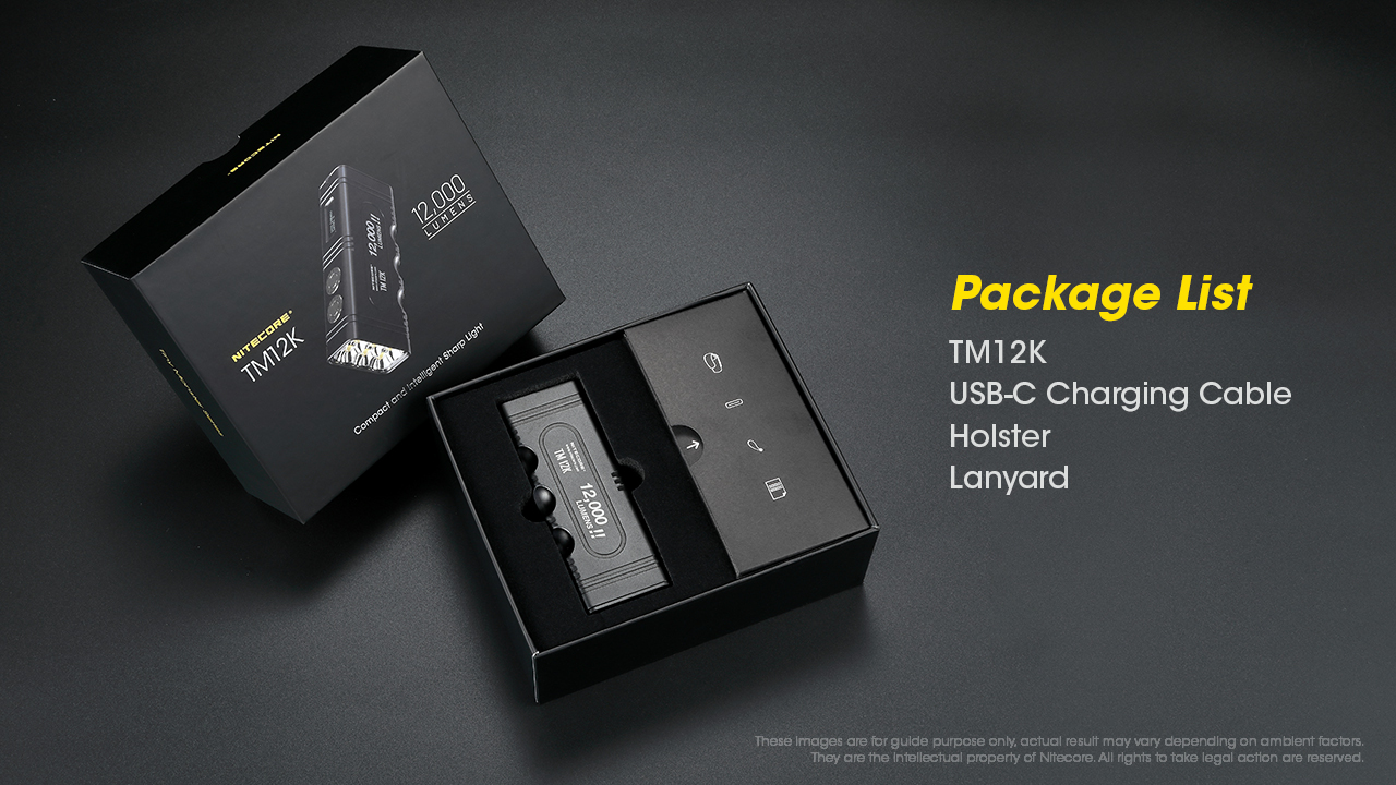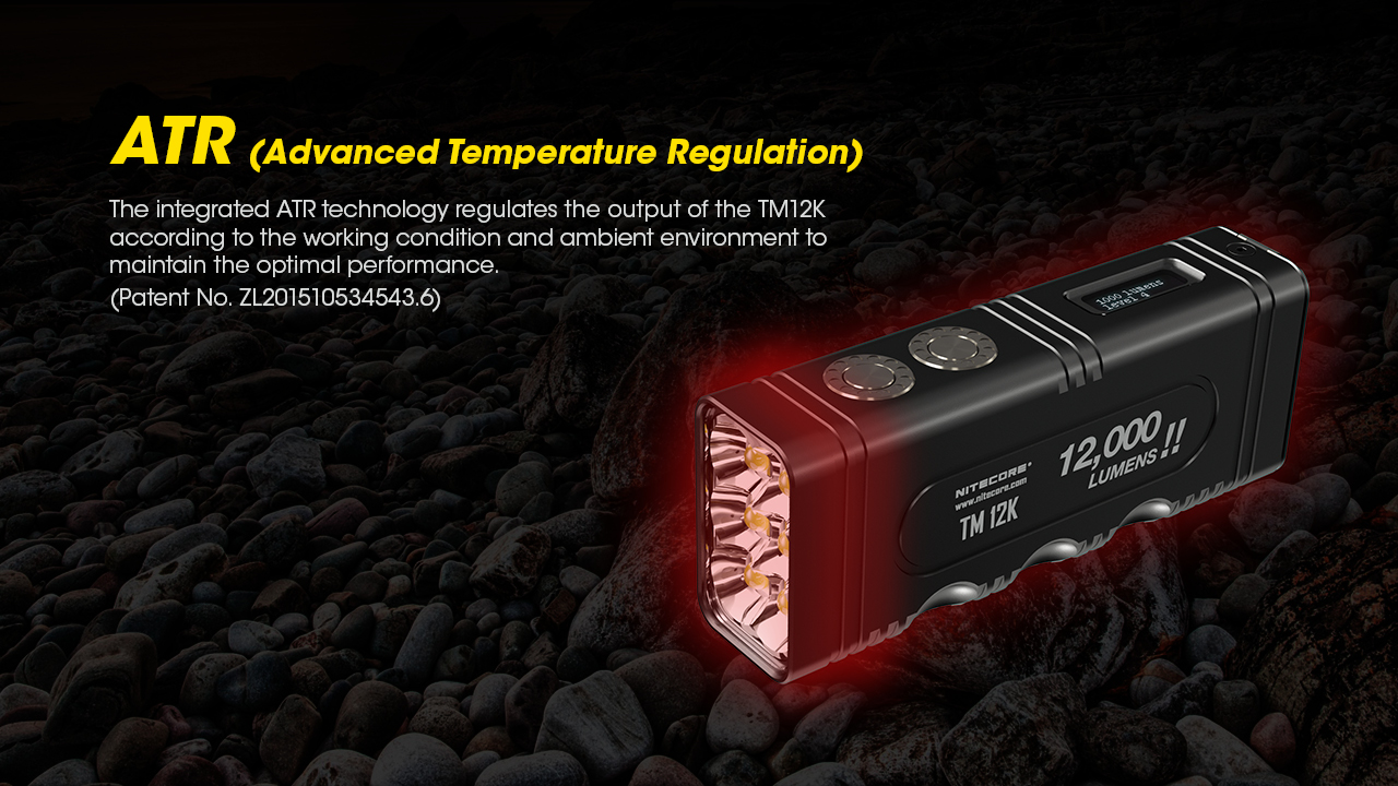 Φακός Χειρός TM12k Tiny Monster της Nitecore Είναι εφοδιασμένος με έξι (6) LED CREE XHP50 που παρέχουν μία ένταση φωτισμού που φθάνει τα 15,600 κεριά και ισχύ δέσμης 12000 Lumens. Ο εργονομικός σχεδιασμός με επτά (7) εσοχές δαχτύλων παρέχει καλύτερο κράτημα και διευκολύνει την χρήση του φακού όταν ο χρήστης φοράει τα γάντια του. Κατασκευασμένο από κράμα αλουμινίου αεροναυπηγικής ποιότητας με φινίρισμα σκληρής ανοδίωσης στρατιωτικών προδιαγραφών HAIII, ο TM12K με σχεδίαση ενιαίου σώματος επεξεργασμένο με την μέθοδο CNC προσφέρει χαμηλό βάρος, στιβαρότητα και εξαιρετική διάχυση της θερμοκρασίας. Η ενσωματωμένη επαναφορτιζόμενη μπαταρία Li-ion χωρητικότητας 4800mAh Υψηλού ρυθμού αποφόρτισης παρέχει ενέργεια για σταθερή χρήση έως και 200 ώρες. Η Πολυ-Λειτουργική Οθόνη Led εμφανίζει σε πραγματικό χρόνο το τρέχων πρόγραμμα λειτουργίας, την τάση της μπαταρίας σε Volt, τον χρόνο λειτουργίας που απομένει, την θερμοκρασία του φακού, με γραφικό σχήμα την ενέργεια της μπαταρίας. Με 2 προγράμματα κλειδώματος, το πρόγραμμα μισού κλειδώματος και τα 2  κομβία (Ισχύος και Λειτουργιών) είναι κλειδωμένα ενώ ο διακόπτης ουράς είναι ακόμα διαθέσιμος για πρόσβαση στην πιο ισχυρή φωτεινότητα των 12000 Lumens. Το πρόγραμμα ολικού κλειδώματος όπου όλα τα κομβία είναι κλειδωμένα, ιδανικό για αποθήκευση μεγάλης διάρκειας ή μεταφορά. Η ενσωματωμένη τεχνολογία ATR ρυθμίζει την ένταση φωτισμού του TM12K σύμφωνα με τις συνθήκες λειτουργίας και το γύρω περιβάλλον έτσι ώστε να διατηρείται η βέλτιστη απόδοση. (Ευρεσιτεχνία No. ZL201510534543.6)