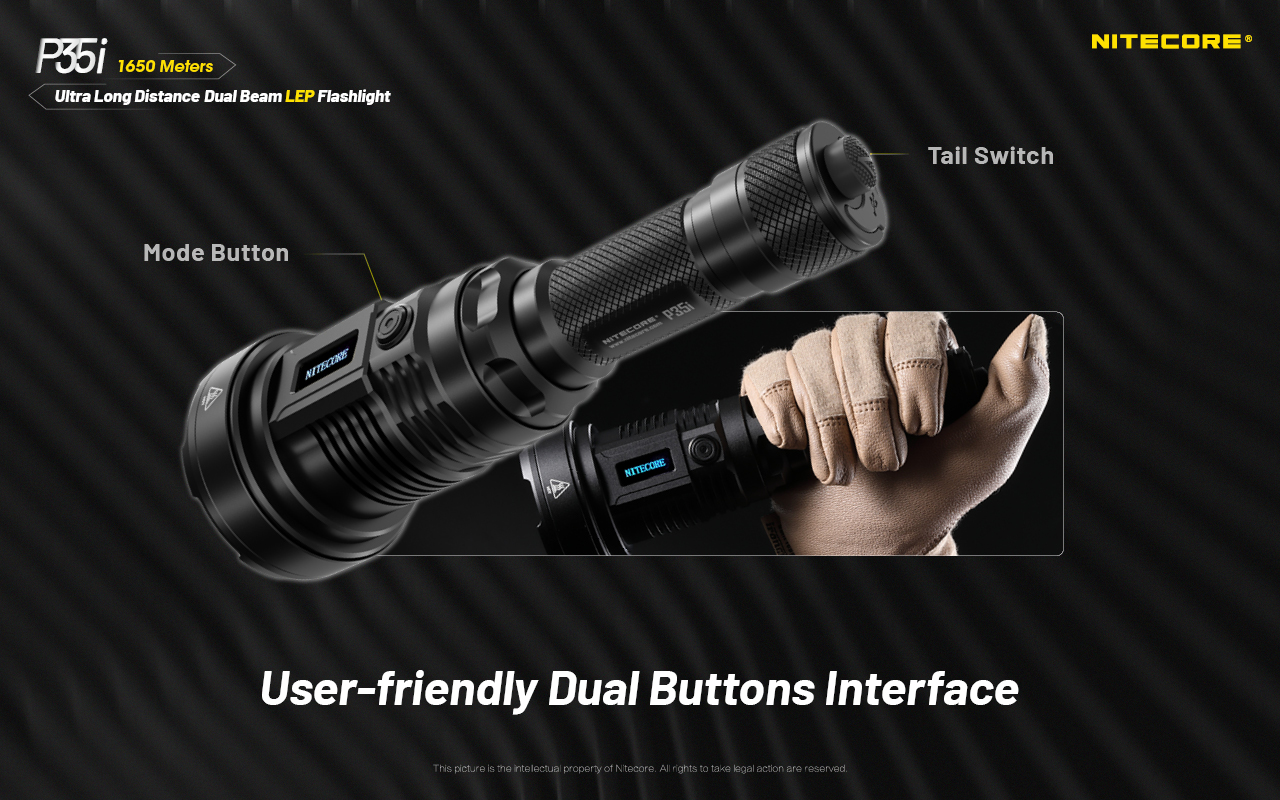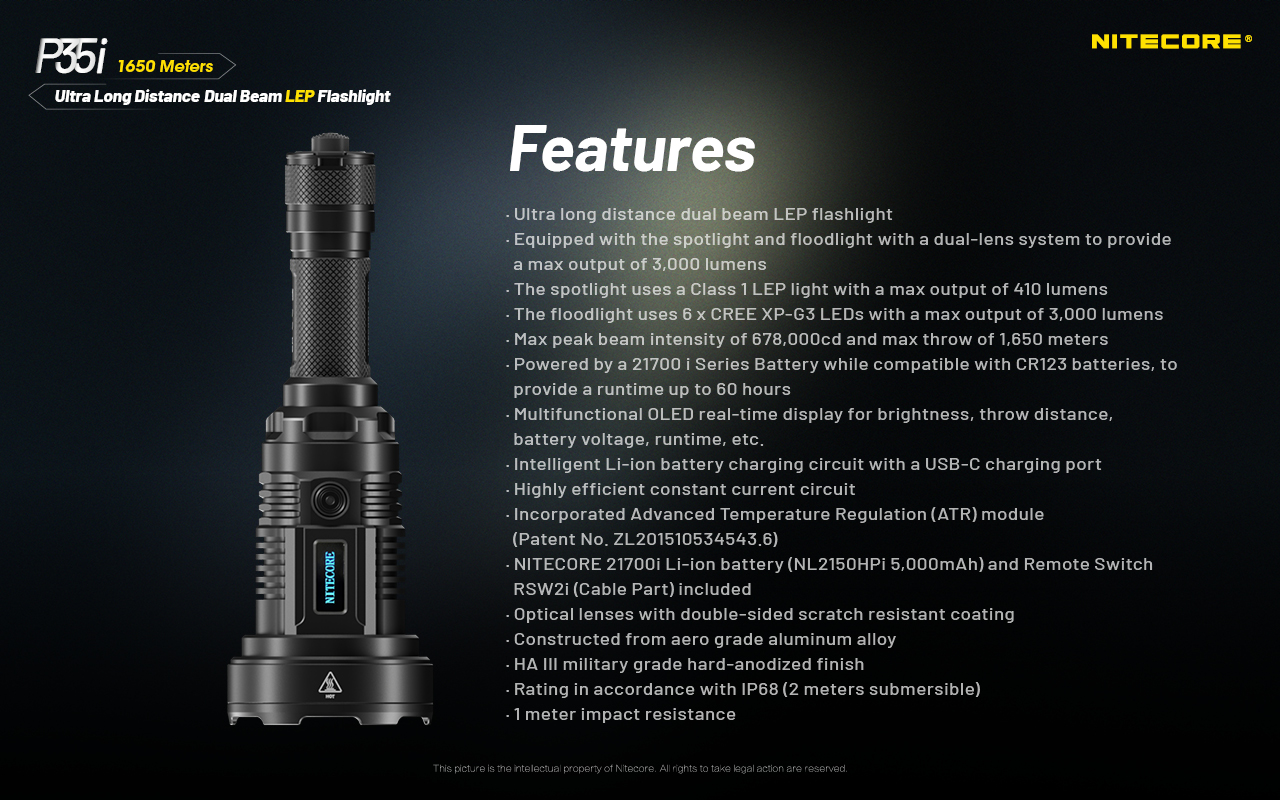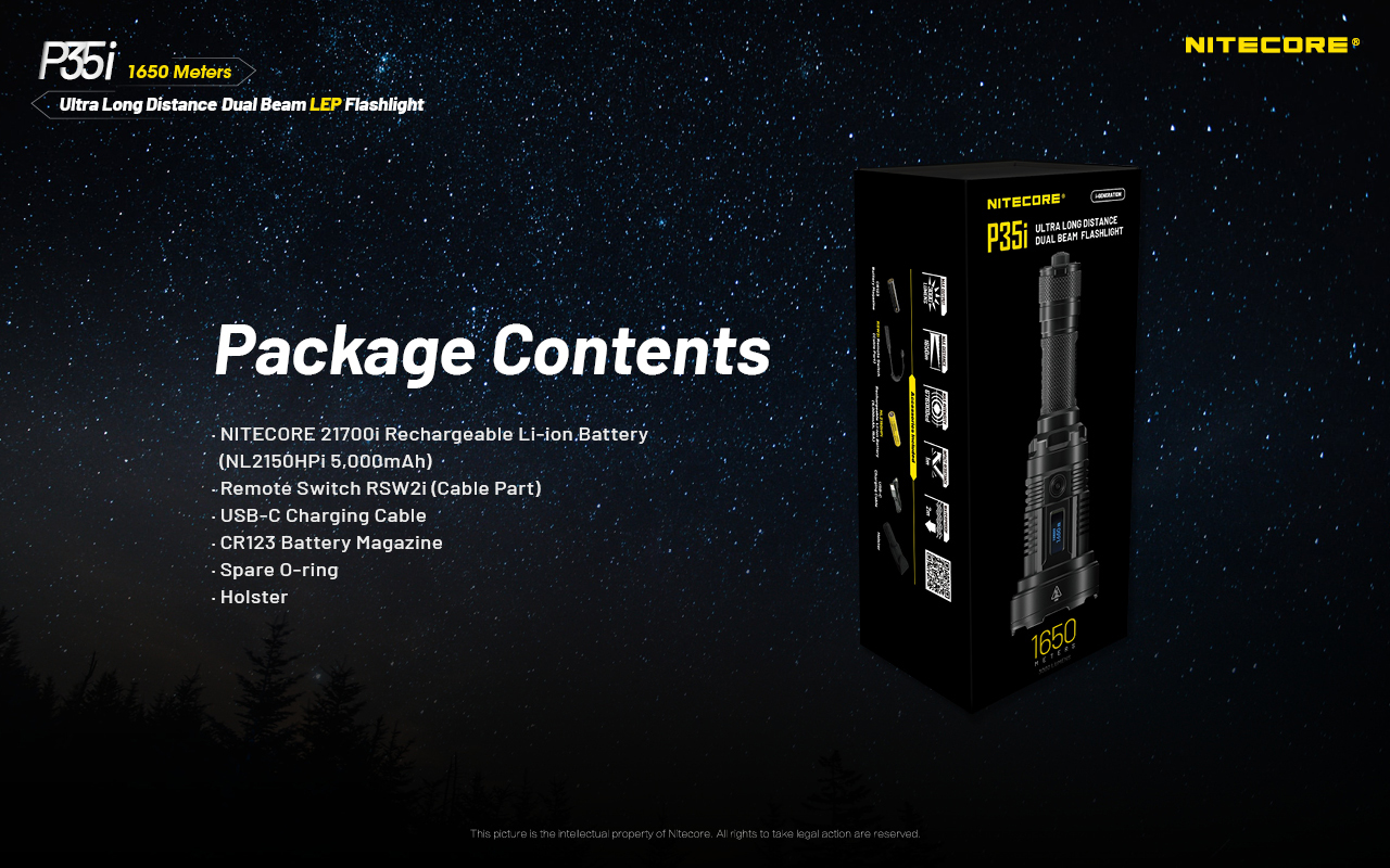 - Στη συσκευασία περιλαμβάνονται μία μπαταρία NITECORE 21700i (NL2150i / 5000mAh) και ένας απομακρυσμένος καλωδιακός διακόπτης ελέγχου RSW2i