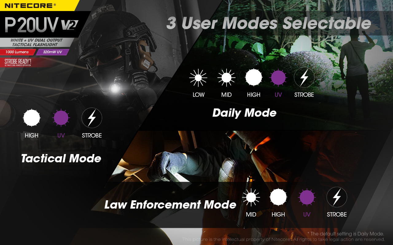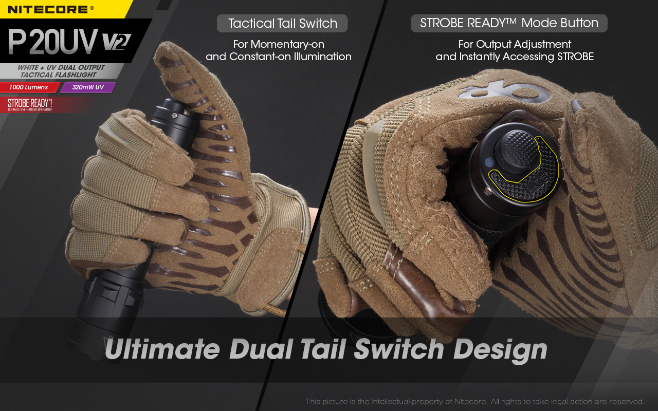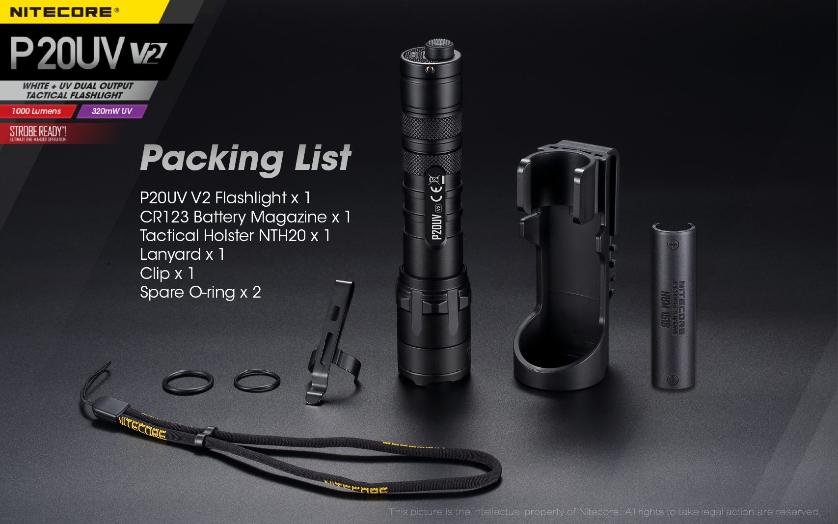 Φακός Χειρός Led Nitecore Precise P20UV Κωδ. 9110101090, με δύο κεντρικές πηγές φωτισμού λευκό στα 1000Lumens και 320mV στο υπεριώδες! Το μοντέλο V2 είναι μία πολύ ισχυρή αναβάθμιση βασισμένη στην εμπειρία χιλιάδων χρηστών που στόχο έχει να αναζητήσει την χωρίς προηγούμενο επιχειρησιακή εμπειρία συνδυάζοντας παράλληλα την κλασική ομορφιά. Βελτιωμένος για επιχειρησιακή χρήση με 1000 Lumens στον Λευκό φωτισμό, μία αύξηση +25% από το προηγούμενο μοντέλο. Ενσωματώνει ένα LED CREE XP-L2 V6 που παράγει την φωτεινότητα των 1000 Lumens με μέγιστη ένταση 6700 κεριά και απόσταση 164 μέτρα ιδανικός για τα σώματα ασφαλείας, τις περιπολίες και για καθημερινή χρήση σε κάθε δύσκολο περιβάλλον. Ο υπεριώδης φωτισμός προέρχεται από 4 x UV LED με μήκος κύματος 365nm. Ο φωτισμός αυτός είναι ικανός να ενεργοποιήσει τα φωσφορίζοντα υλικά, ειδικά σχεδιασμένος για τον έλεγχο στις περιπολίες, για την εκμετάλλευση ορυχείων, για την εγκληματολογία καθώς και για την εκτίμηση των πολύτιμων λίθων, τον έλεγχο γνησιότητας εγγράφων και την αναζήτηση πλαστών χαρτονομισμάτων. Υπολογισμένος με ακρίβεια ανακλαστήρας OP ώστε να εκπέμπει μία ομαλή και απλωμένη δέσμη. Η 2ης γενιάς τεχνολογία άμεσου φωτισμού STORBE βοηθά στην λειτουργία του φακού με το ένα χέρι, ενεργοποιεί τον φωτισμό STORBE σε οποιαδήποτε κατάσταση του φακού και το κομβίο βρίσκεται στο ίδιο επίπεδο με την επιφάνεια του πίσω διακόπτη ώστε να αποφεύγεται η ατυχής ενεργοποίηση US patent 15/846299 US10237955B1, και είναι σχεδιασμένη για επιχειρησιακή χρήση και ευρεσιτεχνία με αριθμό ZL201320545349.4! Ο δακτύλιος κρούσης του P20UV V2 είναι αναβαθμισμένος με υψηλής σκληρότητας κεραμικά νιτριδίου του πυριτίου, που επιτρέπει γρήγορη και εύκολη χρήση για αυτοάμυνα, θραύση κρυστάλλων αλλά παράλληλα οι ακίδες έχουν ομαλή επιφάνεια ώστε να μην προκαλούν γρατζουνιές, να μην σκαλώνουν στα ρούχα ή στο σακίδιο. Επίσης ο επιχειρησιακός οπίσθιος διακόπτης δίνει την δυνατότητα για στιγμιαίο ή μόνιμα ενεργοποιημένο φωτισμό. Ο διακόπτης για το άμεσο STORBE επιτρέπει την στιγμιαία ενεργοποίηση του. Ο φακός διαθέτει τρείς μεθόδους λειτουργίας. Την επιχειρησιακή μέθοδο όπου είναι διαθέσιμοι ο ισχυρός φωτισμός HIGH, ο υπεριώδης φωτισμός UV και ο φωτισμός STORBE. Στην καθημερινή μέθοδο είναι διαθέσιμοι ο χαμηλός φωτισμός LOW, ο μεσαίος φωτισμός MID, ο υψηλός φωτισμός HIGH, ο υπεριώδης φωτισμός UV και ο φωτισμός STORBE. Στην μέθοδο σωμάτων ασφαλείας είναι διαθέσιμοι ο μεσαίος φωτισμός MID, ο υψηλός φωτισμός HIGH, ο υπεριώδης φωτισμός UV, και ο φωτισμός STORBE! Η επιλογή της μεθόδου λειτουργίας γίνεται όταν με ξεβιδωμένο το καπάκι του πίσω διακόπτη, βιδώνουμε με πατημένο τον διακόπτη του άμεσου STORBE. Με την ολοκλήρωση του βιδώματος η ενδεικτική λυχνία αναβοσβήνει για να καταδείξει την επιλεγμένη μέθοδο. Ένα αναβόσβημα καταδεικνύει ότι έχει επιλεγεί η Επιχειρησιακή μέθοδος. Δύο αναβοσβήματα καταδεικνύουν ότι έχει επιλεγεί η μέθοδος για τα σώματα ασφαλείας και τρία αναβοσβήματα καταδεικνύουν ότι έχει επιλεγεί η καθημερινή μέθοδος. Με την λειτουργία μνήμης που διαθέτει όταν ενεργοποιηθεί ξανά θα μεταβεί στο τελευταίο απομνημονευμένο επίπεδο φωτεινότητας! Ο P20UV μπορεί να τροφοδοτηθεί από μία μπαταρία 18650 και να έχει την μέγιστη διάρκεια λειτουργίας που φθάνει τις 46 ώρες ενώ ταυτόχρονα μπορεί να λειτουργήσει και με δύο μπαταρίες CR123 ή RVR123. Στην συσκευασία περιλαμβάνεται ειδικός αντάπτορας για μπαταρίες CR123. Η ενδεικτική λυχνία 