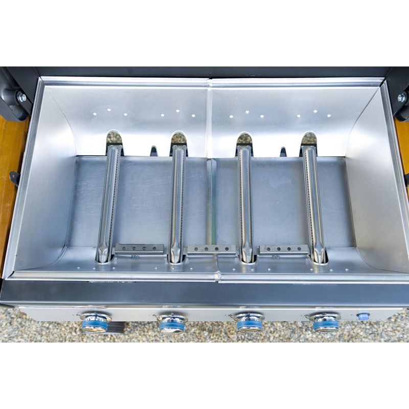 - Οι ειδικά σχεδιασμένοι καυστήρες δημιουργούν φλόγες σχήματος V που οδηγούνται μέσω του καλύπτρου προς την επιφάνεια ψησίματος διαχέοντας τη θερμότητα ομοιόμορφα σε όλη την επιφάνεια ψησίματος.
