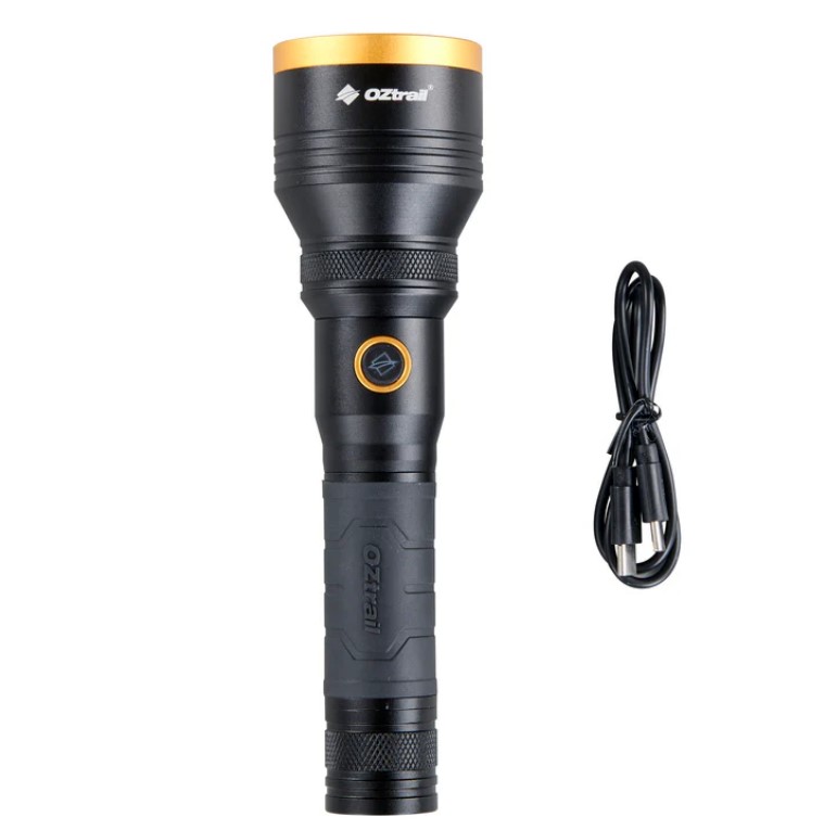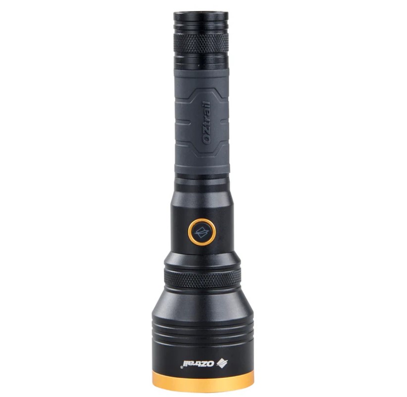 Φακός OZtrail Lumos LongBeam με 1200 lumens και εμβέλεια 1000 μέτρων, ιδανικός για κάμπινγκ.