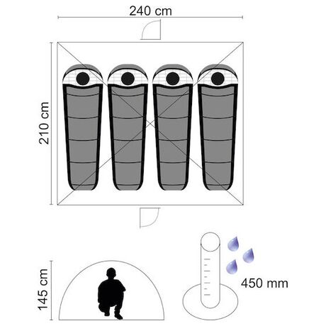 Σκήνη 4 Ατόμων της Nova με άνετες διαστάσεις 210x240x145cm για να σας φιλοξενεί με άνεση σε όλες τις υπαίθριες δραστηριότητες σας. Με 2 μπανέλες Fiberglass 7.9mm για εύκολο στήσιμο μέσα σε λίγα μόλις λεπτά. Διαθέτει 1 παράθυρο με κουνουπιέρα για την προστασία σας από τα έντομα και πόρτα με κουνουπιέρα για εύκολη πρόσβαση.