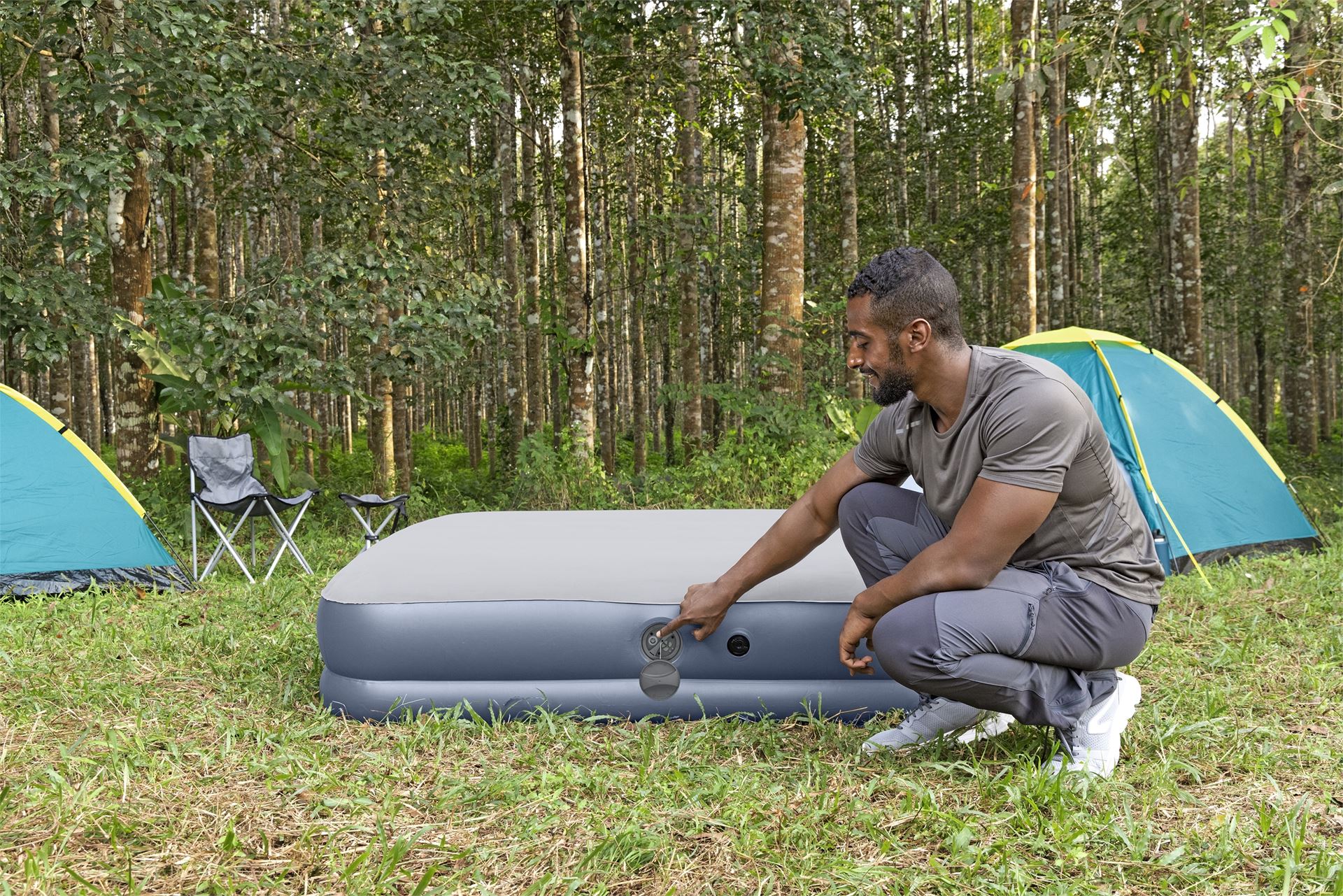 Διαθέτει φορητή ηλεκτρική αντλία με επαναφορτιζόμενη μπαταρία, η οποία φορτίζει μέσω USB και προσφέρει ασύρματη ευκολία και γρήγορο φούσκωμα (περίπου 240 δευτερόλεπτα). Με μία πλήρη φόρτιση μπορούν να πραγματοποιηθούν έως και δύο κύκλοι φουσκώματος, καθιστώντας το ιδανικό για εσωτερική και εξωτερική χρήση. -