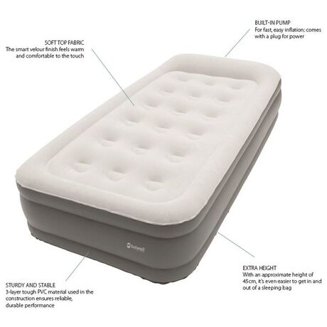 Ένα διπλό και ψηλό - 3 στρώσεων - φουσκωτό στρώμα ύπνου Outwell με ενσωματωμένη ηλεκτρική αντλία για το εύκολο φούσκωμα/ξεφούσκωμά του! Με βελούδινη την πάνω επιφάνειά του για μεγαλύτερη αίσθηση πολυτέλειας και άνεσης, αλλά και για να μην γλιστράνε τα σκεπάσματά σας, είναι η πιο οικονομική και βολική λύση για ύπνο σαν στο κρεβάτι σας στο camping, το εξοχικό και κάθε άλλη συνθήκη ανάγκης! Ο έξυπνος σχεδιασμός του και το μεγάλο ύψος του - 45 εκατοστά - επιτρέπει στους κατασκηνωτές να κοιμούνται, απολαμβάνοντας εξαιρετική μόνωση και άνεση, αλλά και να μπαινοβγαίνουν πιο εύκολα στον υπνόσακο που τυχόν χρησιμοποιούν! Η υπερυψωμένη ολόπλευρη μπορντούρα του προσφέρει επιπλέον σταθερότητα, ενώ το σκληρό PVC υλικό του ανταπεξέρχεται με τον καλύτερο τρόπο στις απαιτήσεις της διαβίωσης στην ύπαιθρο! Απόλυτα αξιόπιστο και πρακτικό, αποθηκεύεται και μεταφέρεται πανεύκολα μέσα στην ειδική τσάντα που το συνοδεύει!