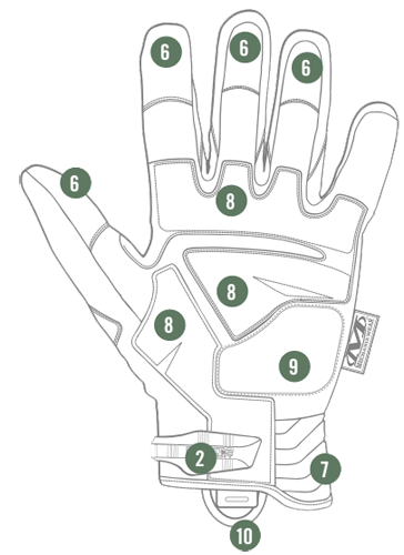 στη σκανδάλη και σωστό χειρισμό του εξοπλισμού ο δείκτης δεν διαθέτει προστατευτικό από θερμοπλαστικό καουτσούκ (TPR). Οι περιοχές υψηλής φθοράς στην παλάμη είναι παραγεμισμένες με υλικό XRD® που απορροφά τους κραδασμούς και μειώνει την κόπωση του χεριού στο πεδίο και η μανσέτα από χυτό νεοπρένιο παρέχει πολύ καλή εφαρμογή στον καρπό. Η κατασκευή της παλάμης δύο περιοχών ενισχύει τις περιοχές υψηλής φθοράς και μειώνει το "μάζεμα" του υφάσματος κατά την χρήση των όπλων ή των εργαλείων. Γάντια προστασίας από την μεγαλύτερη Αμερικάνικη εταιρία στο είδος που προμηθεύει και τον Αμερικάνικο Στρατό.