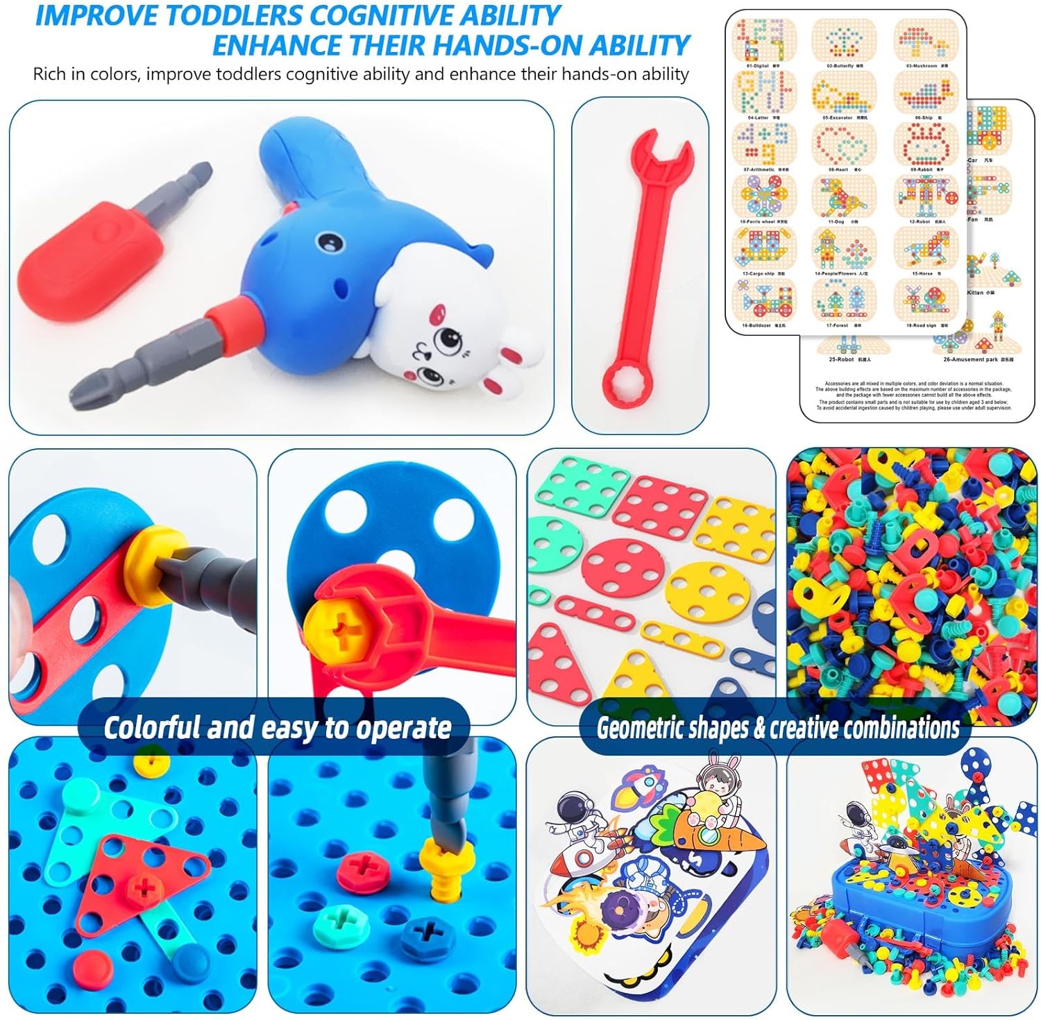 Σετ κατασκευών DIY με πολύχρωμα σχήματα, εργαλεία, βίδες και βάση κατασκευών που μετατρέπεται σε βαλιτσάκι μεταφοράς, από ασφαλή μη τοξικά υλικά.