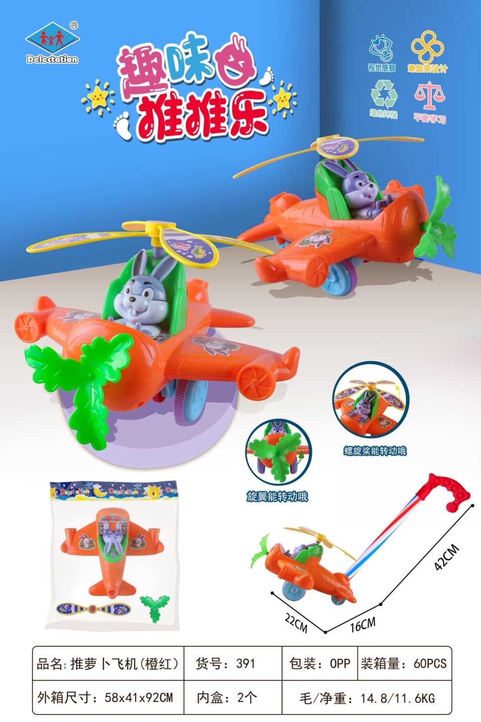 Συρόμενο παιχνίδι Αεροπλανάκι με Κουνελάκι και έλικες που κινούνται, με υπέροχο πολύχρωμο σχεδιασμό και εργονομική λαβή για ατελείωτες βόλτες παντού!