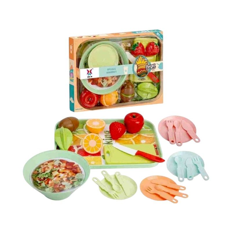 Παιχνίδι κοπής τροφίμων με πλήρες σετ αξεσουάρ σε υπέροχο ρεαλιστικό σχεδιασμό για ένα δημιουργικό παιχνίδι εξάσκησης δεξιοτήτων.