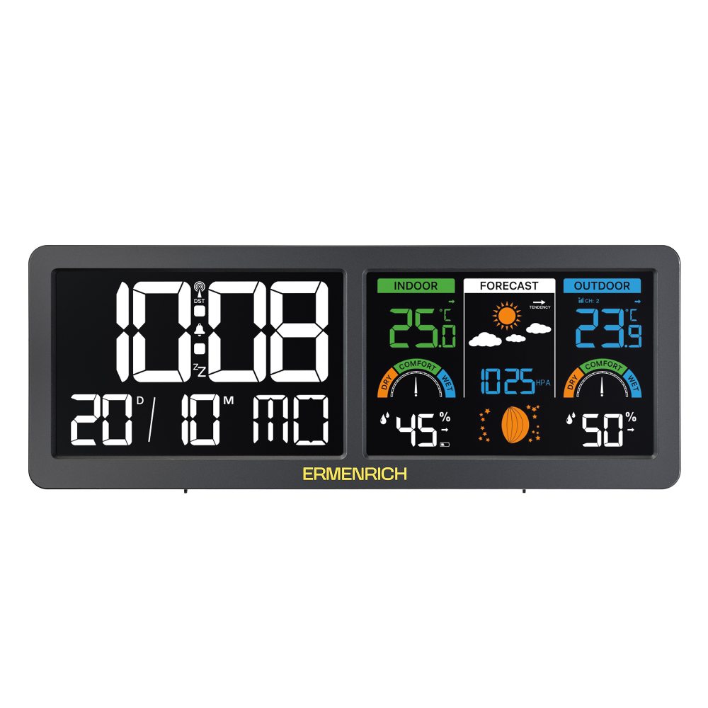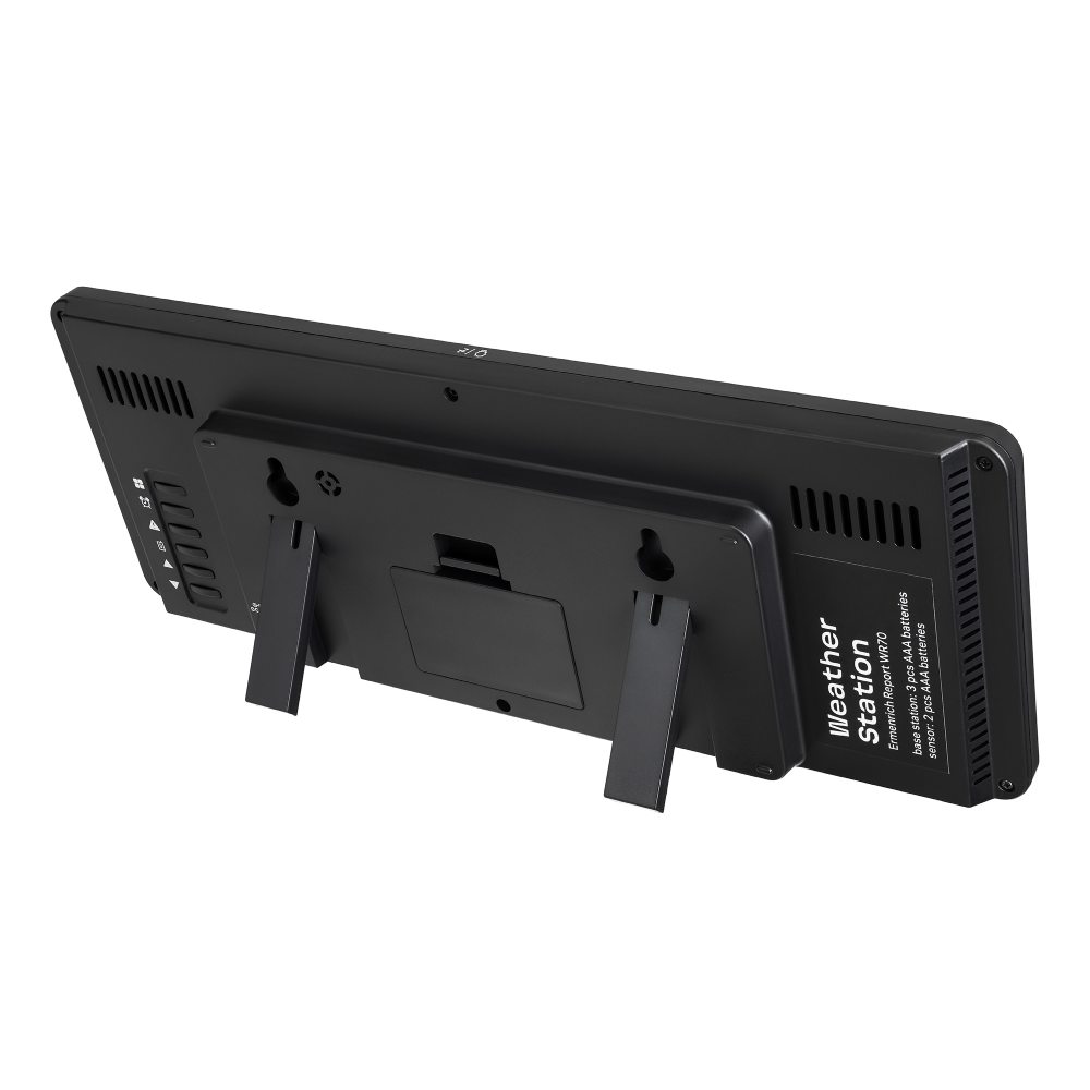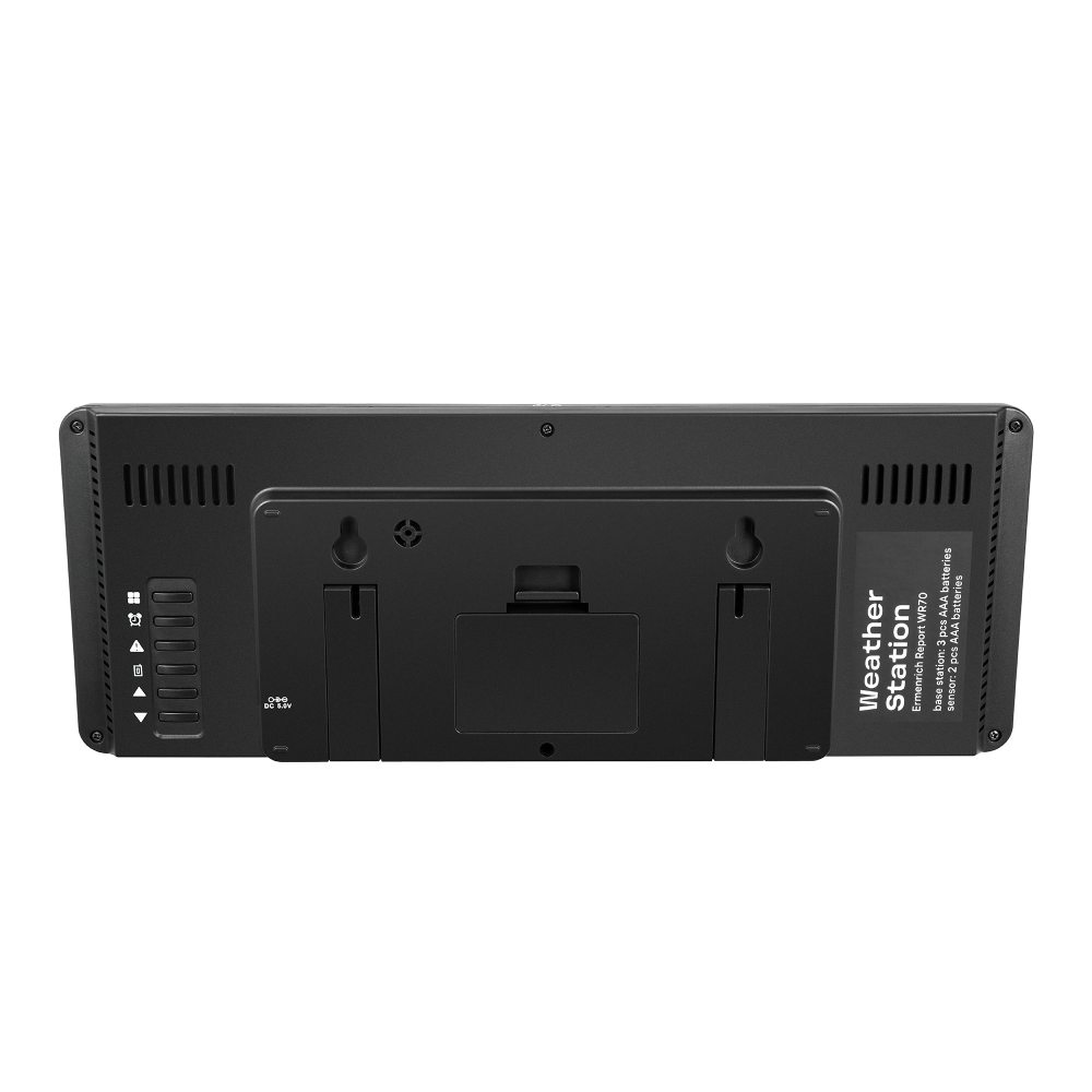 Το Ermenrich Report WR70 είναι ένας πολυλειτουργικός οικιακός μετεωρολογικός σταθμός που παρέχει ολοκληρωμένα δεδομένα για τις εξωτερικές συνθήκες, το εσωτερικό μικροκλίμα, τις φάσεις της Σελήνης, καθώς και μια βραχυπρόθεσμη πρόγνωση καιρού. Διαθέτει δύο οθόνες υψηλής ευκρίνειας: η αριστερή εμφανίζει την ώρα, την ημερομηνία, τον μήνα, την ημέρα της εβδομάδας και την κατάσταση του ξυπνητηριού (ενεργοποιημένο/απενεργοποιημένο), ενώ η δεξιά εμφανίζει τη θερμοκρασία και την υγρασία του αέρα, έναν δείκτη επιπέδου άνεσης, την ατμοσφαιρική πίεση και άλλα μετεωρολογικά δεδομένα. Στη συσκευασία επίσης, περιλαμβάνεται ένας ασύρματος αισθητήρας εξωτερικού χώρου για ακριβή παρακολούθηση του καιρού, ο οποίος λειτουργεί με δύο μπαταρίες AAA (συνιστάται η χρήση αλκαλικών), είναι κατασκευασμένος για να αντέχει στις καιρικές συνθήκες και έχει εμβέλεια έως 80 m από την βάση του σταθμού.