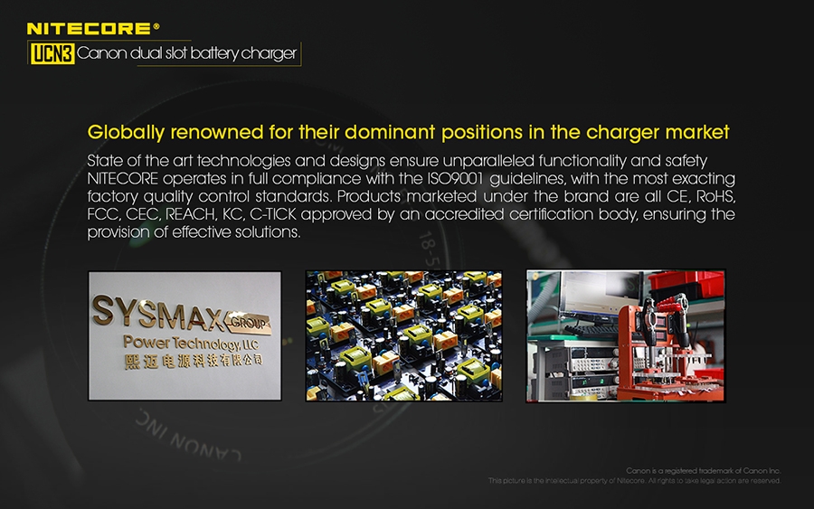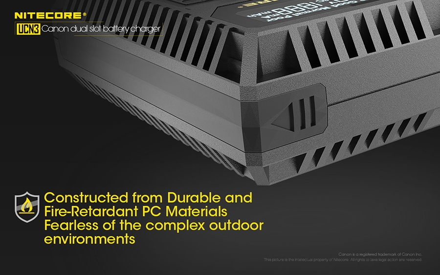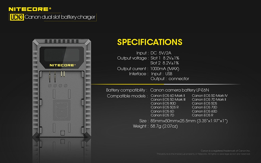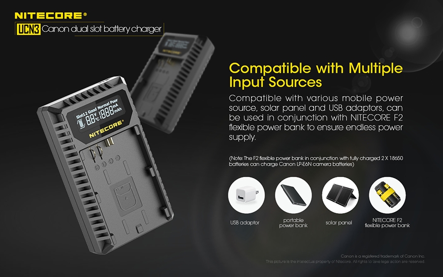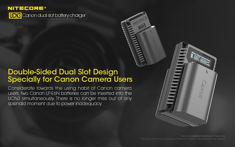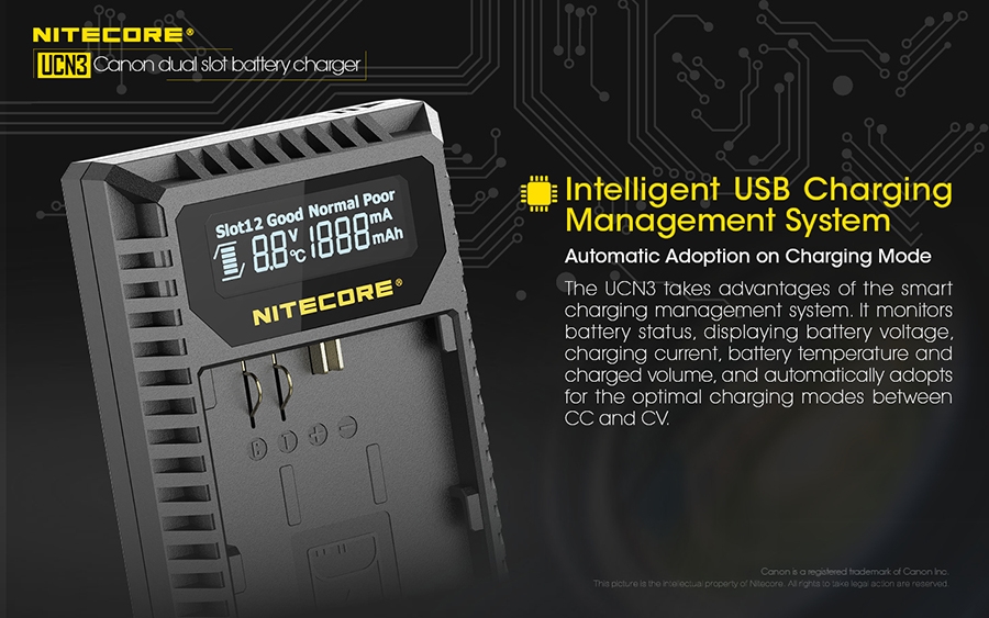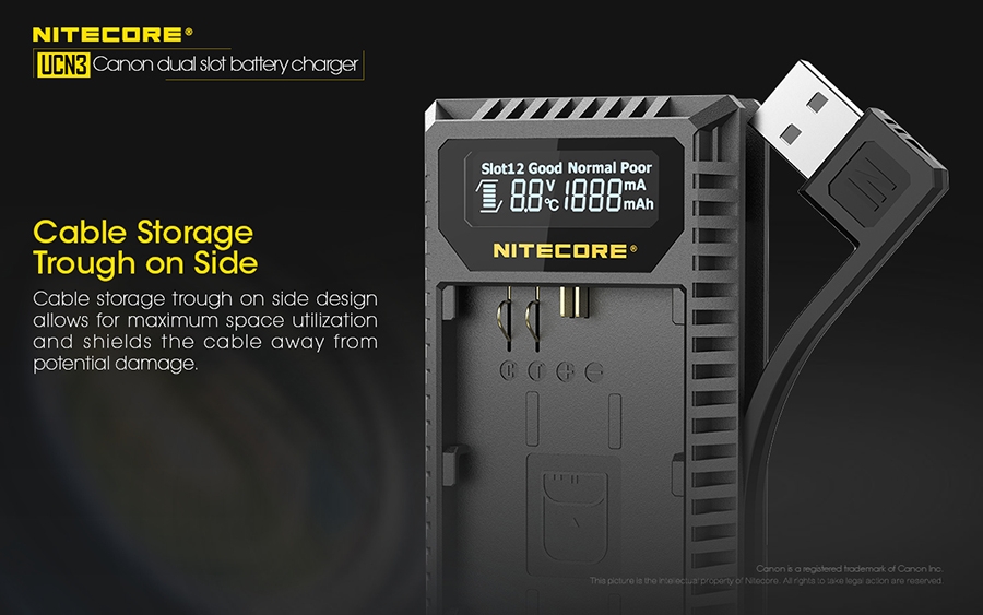 Φορτιστής για μπαταρίες φωτογραφικών μηχανών CANON LP-E6N με δύο θέσεις φόρτισης.Απολαύστε την ατελείωτη παροχή ενέργειας στις εξωτερικές σας δραστηριότητες. Φορτίζει με εώς και 1000mA σε μία θέση φόρτισης.Είναι συμβατός με διάφορες πηγές ενέργειας όπως αντάπτορες USB, ηλιακά πάνελς, φορητές τράπεζες ενέργειας (Power Banks) αλλά μπορεί να συνεργαστεί και με τον NITECORE F2.Το έξυπνο σύστημα ελέγχου της φόρτισης, παρακολουθεί την κατάσταση της μπαταρίας, εμφανίζει την τάση της, το ρεύμα φόρτισης, την θερμοκρασία της και την ποσότητα που έχει φορτιστεί.Ταυτόχρονα προσαρμόζει αυτόματα την λειτουργία φόρτισης ανάμεσα σε CC και CV.Η οθόνη υγρών κρυστάλλων (LCD) υψηλής ευκρίνειας εμφανίζει σε πραγματικό χρόνο τις διάφορες πληροφορίες της φόρτισης.Μόλις η μπαταρία εισαχθεί για φόρτιση, ο UCN3 θα την φορτίσει με ένα αρχικό ρεύμα και αυτόματα θα ανιχνεύσει την κατάσταση της.Στην συνέχεια θα εμφανιστεί στην οθόνη η υγεία της μπαταρίας ως "ΚΑΛΗ" (Good), "ΚΑΝΟΝΙΚΗ" (Normal), "ΦΤΩΧΗ" (Poor).Ο UCN3 έχει την δυνατότητα να ενεργοποιήσει αυτόματα υπερ-αποφορτισμένες από κακή αποθήκευση ή κακή χρήση.Διαθέτει μηχανική προστασία από ανάποδη πολικότητα και από βραχυκύκλωμα.Είναι κατασκευασμένος από ανθεκτικά, επιβραδυντικά της φωτιάς πολυκαρβονικά (PC) υλικά.Το καλώδιο USB αποθηκεύεται άνετα στο πλάι της συσκευής και ταυτόχρονα προστατεύεται.