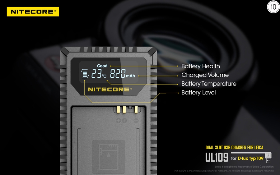 Πρακτικός φορτιστής από την Nitecore, ιδανικός για όσους θέλουν να απολαμβάνουν την αδιάλειπτη χρήση της φωτογραφικής τους μηχανής! Ο φορτιστής δύο θέσεων UL109 είναι ειδικά σχεδιασμένος για τη Leica D-Lux typ109, ενώ είναι συμβατός για χρήση με μπαταρίες φωτογραφικών μηχανών BP-DC15-E. Είναι ανθεκτικά κατασκευασμένος από πολυκαρβονικό και ABS υλικό, ενώ διαθέτει πρακτικό σχεδιασμό με αποθήκευση του καλωδίου του στο πλευρικό μέρος, για να σας εξασφαλίζει προστασία από τη φθορά, αλλά και εξοικονόμηση χώρου. Ενσωματώνει οθόνη LCD, στην οποία παρουσιάζονται όλες οι σχετικές με την κατάσταση της μπαταρίας πληροφορίες. Χάρη στην τεχνολογία προστασίας από βραχυκύκλωμα και από την ανάποδη πολικότητα και τα συστήματα ελέγχου κατάστασης της μπαταρίας και διαχείρισης της διαδικασίας φόρτισης μπορεί να σας παρέχει μια ασφαλή και ποιοτική φόρτιση ακόμη και στις αποφορτισμένες σας μπαταρίες! Το προϊόν διαθέτει μέγιστη έξοδο 1000mA και μπορεί να φορτίσει μέχρι 2 μπαταρίες σε 2 ώρες περίπου! Πρόκειται για μια εύχρηστη συσκευή, που θα σας λύσει τα χέρια στην επαναφόρτιση των μπαταριών της φωτογραφικής σας μηχανής!