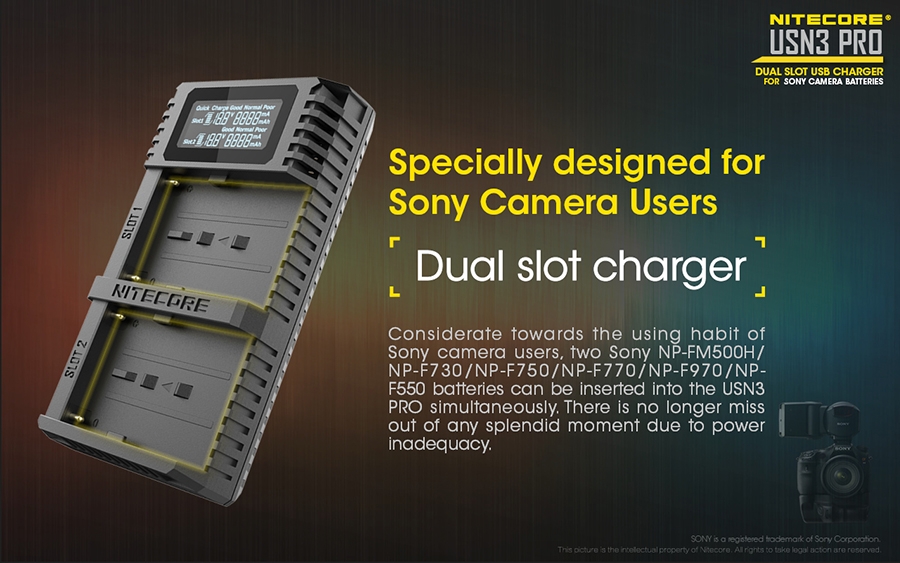 Φορτιστής για μπαταρίες φωτογραφικών μηχανών, βιντεοκαμερών και φωτιστικών της SONY.Συμβατός με τις μπαταρίες NP-FM500H, NP-F730, NP-F750, NP-F770, NP-F970, NP-F550.Διαθέτει δύο θέσεις φόρτισης και φορτίζει από θύρα USB. Υποστηρίζει και Γρήγορη Φόρτιση (QC 2.0) με έξοδο έως και 1200mA.Είναι ένας σύγχρονος επαγγελματικός φορτιστής που σπάει τα δεσμά και καταργεί τους περιορισμούς των φορτιστών που λειτουργούν με συνεχές ρεύμα (AC).Χρειάζεται 3 ώρες για να φορτίσει πλήρως 2 μπαταρίες με την διαδικασία Γρήγορης Φόρτισης (QC 2.0)Οι φορτιστές της NITECORE είναι πολύ γνωστοί για την κυρίαρχη θέση τους στην παγκόσμια αγορά φορτιστών.Η NITECORE λειτουργεί και κατασκευάζει σύμφωνα με το πρότυπο ISO9001.Τα προϊόντα είναι πιστοποιημένα σύμφωνα με CE, RoHS, FCC, CEC, REACH, KC, C-TICK.Ο USN3 Pro είναι συμβατός με πολλές πηγές ενέργειας όπως USB Adaptors, Power Banks, Solar Panles, Nitecore F2 ευέλικτο power bank.Το έξυπνο κύκλωμα φόρτισης, ελέγχει την κατάσταση της μπαταρίας, εμφανίζει την τάση της, το ρεύμα φόρτισης, την ποσότητα φόρτισης,και αυτόματα επιλέγει την ιδανική μέθοδο φόρτισης ανάμεσα στη CC και CV.