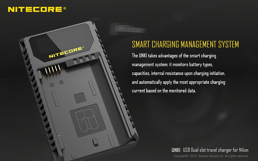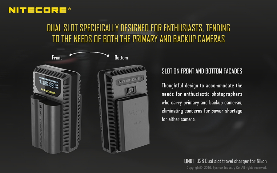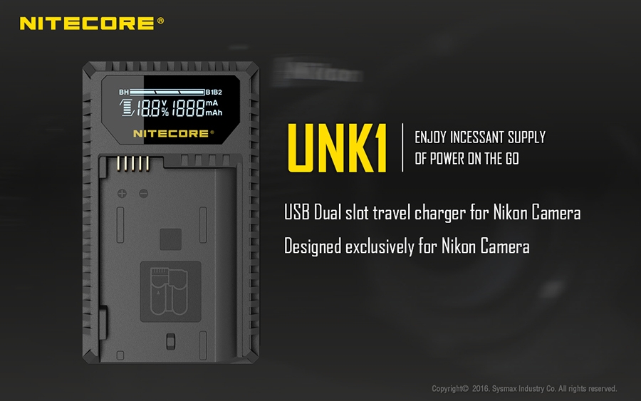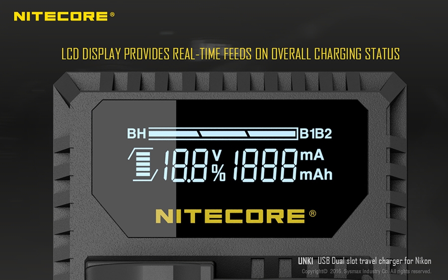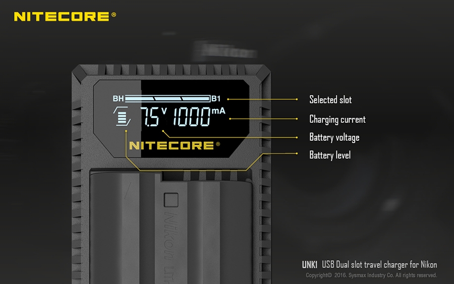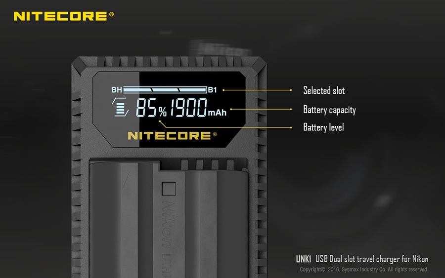 Φορτιστής με την υπογραφή της κορυφαίας εταιρείας Nitecore, σχεδιασμένος αποκλειστικά για φωτογραφικές μηχανές Nikon! Διαθέτει 2 θέσεις φόρτισης, ενώ μπορεί να συνεργαστεί με αντάπτορες USB από 220v από 12v, με powerbanks, ηλιακά panel αλλά και τον Nitecore F1. Είναι εξοπλισμένος με εξελιγμένο λογισμικό φόρτισης το οποίο αναλαμβάνει την διαδικασία φόρτισης της μπαταρίας ξεκινώντας από την αναγνώριση του τύπου της, της χωρητικότητας της και της εσωτερικής της αντίστασης και στη συνέχεια προσαρμόζει αυτόματα το πιο κατάλληλο ρεύμα για την φόρτιση της σύμφωνα με τα στοιχεία. Η ψηφιακή οθόνη του, παρέχει σε πραγματικό χρόνο, πληροφορίες για την εξέλιξη της φόρτισης. Είναι σχεδιασμένος να φέρνει ξανά σε λειτουργία αδρανείς μπαταρίες ή μπαταρίες που έχουν αποφορτιστεί υπερβολικά. Είναι κατασκευασμένος από PC-ABS θερμοπλαστικά υλικά που καθυστερούν την φωτιά.