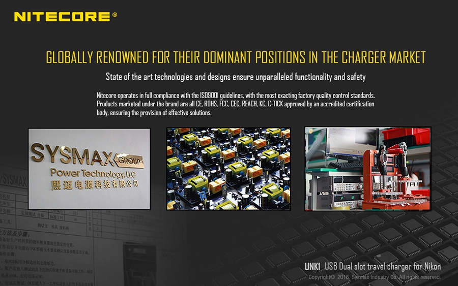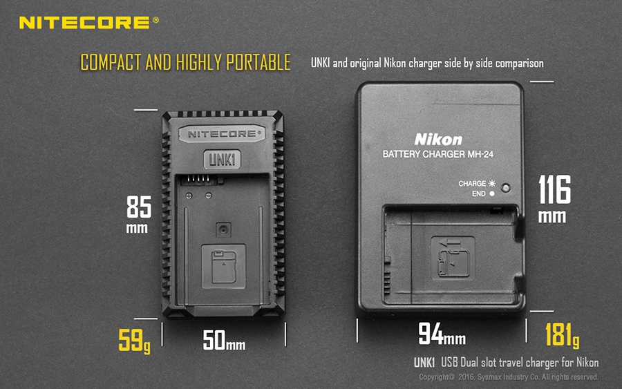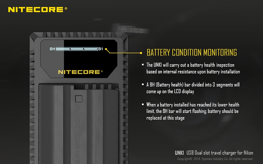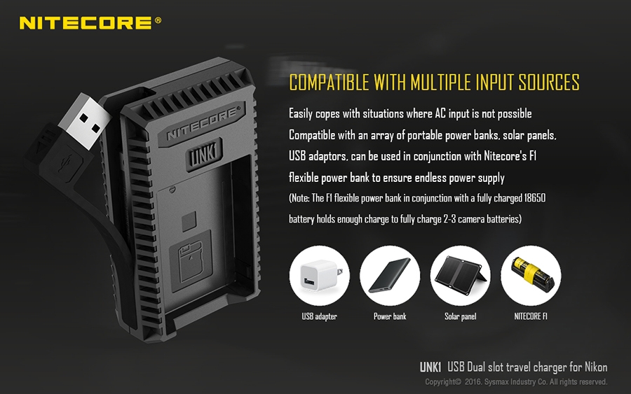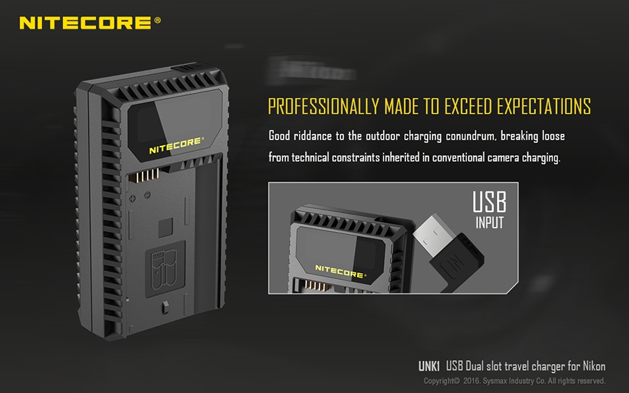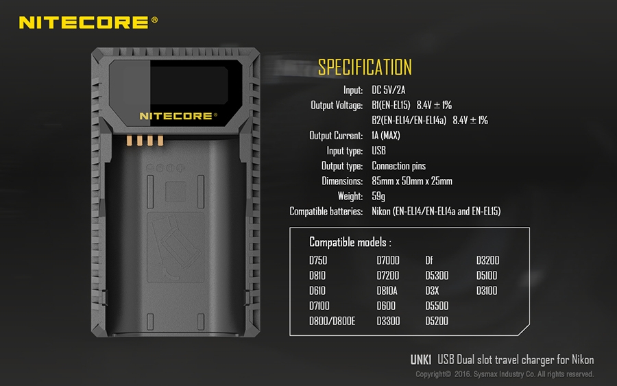 Φορτιστής με την υπογραφή της κορυφαίας εταιρείας Nitecore, σχεδιασμένος αποκλειστικά για φωτογραφικές μηχανές Nikon! Διαθέτει 2 θέσεις φόρτισης, ενώ μπορεί να συνεργαστεί με αντάπτορες USB από 220v από 12v, με powerbanks, ηλιακά panel αλλά και τον Nitecore F1. Είναι εξοπλισμένος με εξελιγμένο λογισμικό φόρτισης το οποίο αναλαμβάνει την διαδικασία φόρτισης της μπαταρίας ξεκινώντας από την αναγνώριση του τύπου της, της χωρητικότητας της και της εσωτερικής της αντίστασης και στη συνέχεια προσαρμόζει αυτόματα το πιο κατάλληλο ρεύμα για την φόρτιση της σύμφωνα με τα στοιχεία. Η ψηφιακή οθόνη του, παρέχει σε πραγματικό χρόνο, πληροφορίες για την εξέλιξη της φόρτισης. Είναι σχεδιασμένος να φέρνει ξανά σε λειτουργία αδρανείς μπαταρίες ή μπαταρίες που έχουν αποφορτιστεί υπερβολικά. Είναι κατασκευασμένος από PC-ABS θερμοπλαστικά υλικά που καθυστερούν την φωτιά.