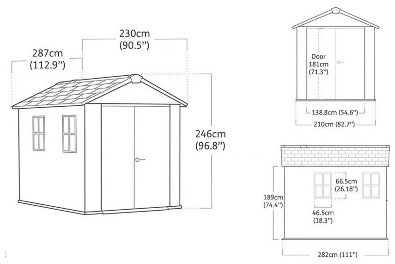 - Εξωτερικές διαστάσεις: 230 × 350 × 246 cm (Π × Β × Υ)