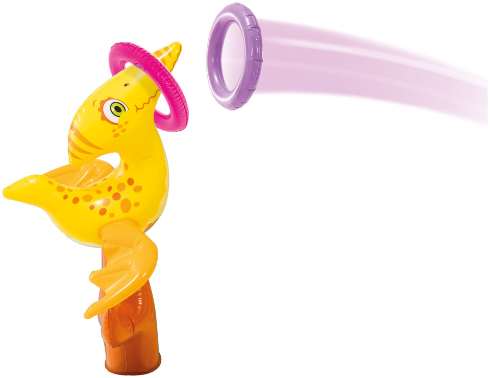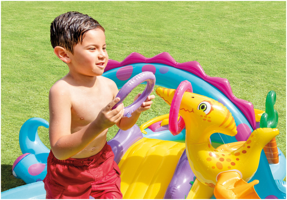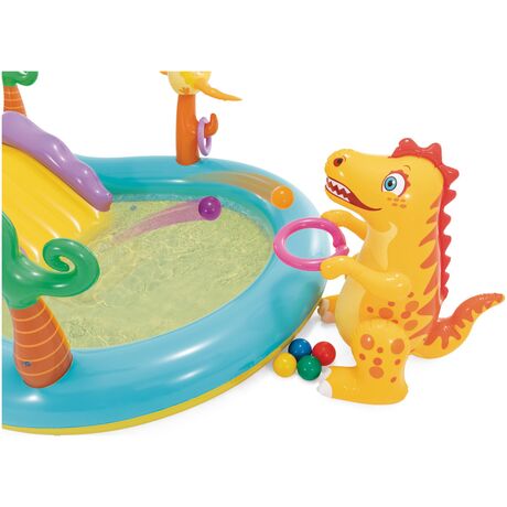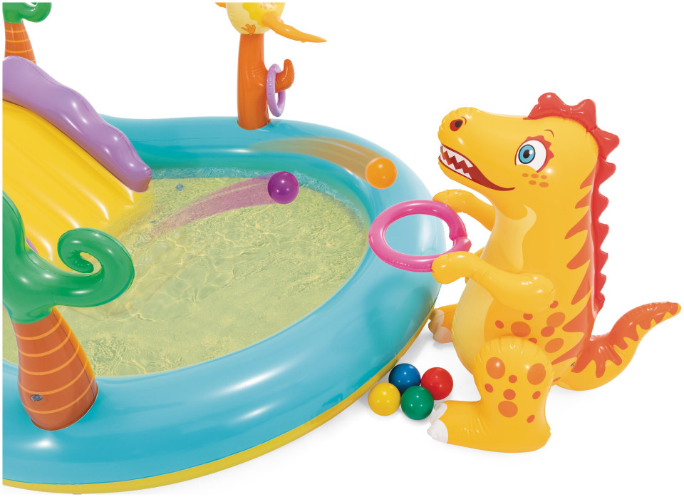 Αυτή η πρωτότυπη πισίνα δεν υπάρχει περίπτωση να μην ενθουσιάσει τους μικρούς μας φίλους! Τώρα τα παιδιά σας δεν θα σταματούν να διασκεδάζουν και να δροσίζονται, τσουλώντας από την τσουλήθρα στο φουσκωτό χαλάκι προσγείωσης για να "καρφώσουν" τις χρωματιστές μπαλίτσες στη στεφάνη του ανυπόμονου τυρρανόσαυρου, και παίζοντας με τα φουσκωτά δαχτυλίδια και τους άλλους δεινόσαυρους της παρέας! Μην ξεχάσετε να συνδέσετε το λάστιχο του κήπου για να τους προσφέρετε επιπλέον δροσιά κι ευχαρίστηση με το σπρέι νερού στην μετακινούμενη αψίδα που σχηματίζει ο βροντόσαυρος! Ο απόλυτος καλοκαιρινός παιδότοπος που θα κάνει κάθε παιδί χαρούμενο!