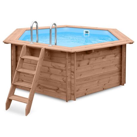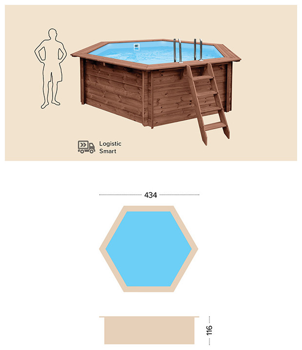 Μία στρογγυλή οικογενειακή πισίνα εξαιρετικής ποιότητας με διάμετρο 434 cm και εξωτερικό ύψος 116 cm η οποία ανήκει στην Abatec και διαθέτει χωρητικότητα 8.95m3 νερού. Η πισίνα ταιριάζει εξαιρετικά στον κήπο κάθε σπιτιού λόγω του φυσικού υλικού και του αρχιτεκτονικού σχεδιασμού της και μπορεί να τοποθετηθεί πάνω στο έδαφος ή και μέσα σε αυτό. Είναι κατασκευασμένη από υψηλής ποιότητας ξύλο το οποίο έχει αντοχή στο χρόνο αλλά και στο εξωτερικό υγρό περιβάλλον. Τα τείχη της πισίνας έχουν πάχος 45 mm και επομένως είναι εξαιρετικά καλά θερμομονωμένα. Το βάθος νερού της πισίνας είναι 100 cm,διαθέτει αντιολισθητικό δάπεδο και έτσι είναι ασφαλής για τα παιδιά. Επίσης διαθέτει αποσπώμενη σκάλα για την εύκολη είσοδο και έξοδο στην πισίνα σας. Είναι ιδανική για να δροσιστείτε και να παίξετε τις ζεστές ημέρες του καλοκαιριού με τα αγαπημένα σας πρόσωπα. Συμβουλευτείτε μας σχετικά με τα χημικά καθαριστικά που είναι απαραίτητα για τη συντήρηση και τη σωστή χρήση της πισίνας σας, ώστε να απολαμβάνετε χωρίς φόβο τις βουτιές σας!