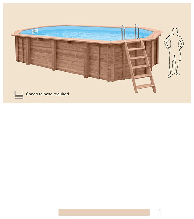 Ξύλινη Πισίνα Ocean Wave Κατασκευασμένη από Σκανδιναβική Ξυλεία και με σκελετό από Πεύκο για μέγιστη αντοχή στον χρόνο. Με άνετες διαστάσεις 7.27 x 3.96cm σας δίνεται η δυνατότητα να απολαμβάνεται ξέγνοιαστες στιγμές χαλάρωσης με την οικογένεια ή την παρέα σας στο σπίτι ή στο εξοχικό σας. Το πλαίσιο της πισίνας είναι ενισχυμένο τόσο με ξύλινα στηρίγματα όσο και με χαλύβδινους στύλους, λόγω αυτής της πρόσθετης στήριξης η πισίνα απαιτεί βάση από σκυρόδεμα και δεν μπορεί να τοποθετηθεί απευθείας στο έδαφος. Οι συνδετήρες από ανοξείδωτο χάλυβα κλάσης A2 διαθέτουν ειδικό σπείρωμα βιδών που αποτρέπει τη χαλάρωση των κεφαλών. Η Συσκευασία περιλαμβάνει όλα τα απαραίτητα για να απολαμβάνεται με άνεση και ασφάλεια την πισίνας μόλις την συναρμολογήσετε. Αναλυτικότερα στην Συσκευασία του προϊόντος περιλαμβάνονται εξωτερικά ξύλινα σκαλοπάτια με αντιολισθητικές αυλακώσεις, εσωτερική σκάλα από ανοξείδωτο χάλυβα, είσοδο(ες) skimmer και επιστροφής, μπλε επένδυση και φύλλο γεωυφάσματος που ταιριάζει μεταξύ της επένδυσης και των τοίχων και του εδάφους.