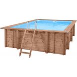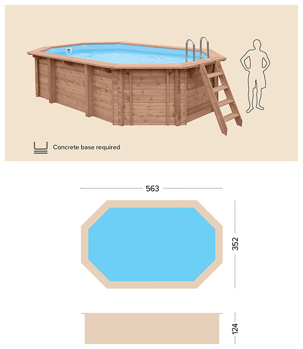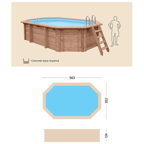 Ξύλινη Πισίνα Sea breeze κατασκευασμένη από Σκανδιναβική Ξυλεία και με σκελετό από Πεύκο για μέγιστη αντοχή στον χρόνο. Με άνετες διαστάσεις 563 x 352 cm σας δίνεται η δυνατότητα να απολαμβάνεται ξέγνοιαστες στιγμές χαλάρωσης με την οικογένεια ή την παρέα σας στο σπίτι ή στο εξοχικό σας. Το πλαίσιο της πισίνας είναι ενισχυμένο τόσο με ξύλινα στηρίγματα όσο και με χαλύβδινους στύλους, λόγω αυτής της πρόσθετης στήριξης η πισίνα απαιτεί βάση από σκυρόδεμα και δεν μπορεί να τοποθετηθεί απευθείας στο έδαφος. Οι συνδετήρες από ανοξείδωτο χάλυβα κλάσης A2 διαθέτουν ειδικό σπείρωμα βιδών που αποτρέπει τη χαλάρωση των κεφαλών. Η Συσκευασία περιλαμβάνει όλα τα απαραίτητα για να απολαμβάνεται με άνεση και ασφάλεια την πισίνας μόλις την συναρμολογήσετε. Αναλυτικότερα στην Συσκευασία του προϊόντος περιλαμβάνονται εξωτερικά ξύλινα σκαλοπάτια με αντιολισθητικές αυλακώσεις, εσωτερική σκάλα από ανοξείδωτο χάλυβα, είσοδο skimmer και επιστροφής, μπλε επένδυση και φύλλο γεωυφάσματος που ταιριάζει μεταξύ της επένδυσης και των τοίχων και του εδάφους.