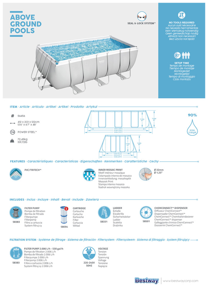 Όταν δεν μπορείτε να δροσιστείτε στην παραλία, μπορείτε στον κήπο σας! Η απίθανη πισίνα BESTWAY με ατσάλινο εξωτερικό σκελετό και διαστάσεις 4,12x2,01x1,22m αποτελεί εγγύηση! Από το ανώτερης ποιότητας υλικό TriTech™ - ένα ενισχυμένο υλικό 3 στρωμάτων με δύο στρώσεις PVC και μία στρώση διχτυού polyester ενδιάμεσα -, το οποίο προσφέρει εξαιρετική δύναμη και στιβαρότητα, αντέχει εξαιρετικά στις ακραίες συνθήκες, την υπεριώδη ακτινοβολία και το χλώριο, και έχει πιστοποιηθεί ως προς την αντοχή του στο βάρος και την πίεση που ασκεί μεγάλος όγκος νερού! Διαθέτει αντλία φίλτρου 220V και σκάλα! Η ιδανική επιλογή για ένα δροσερό καλοκαίρι στο σπίτι σας!