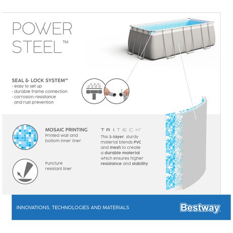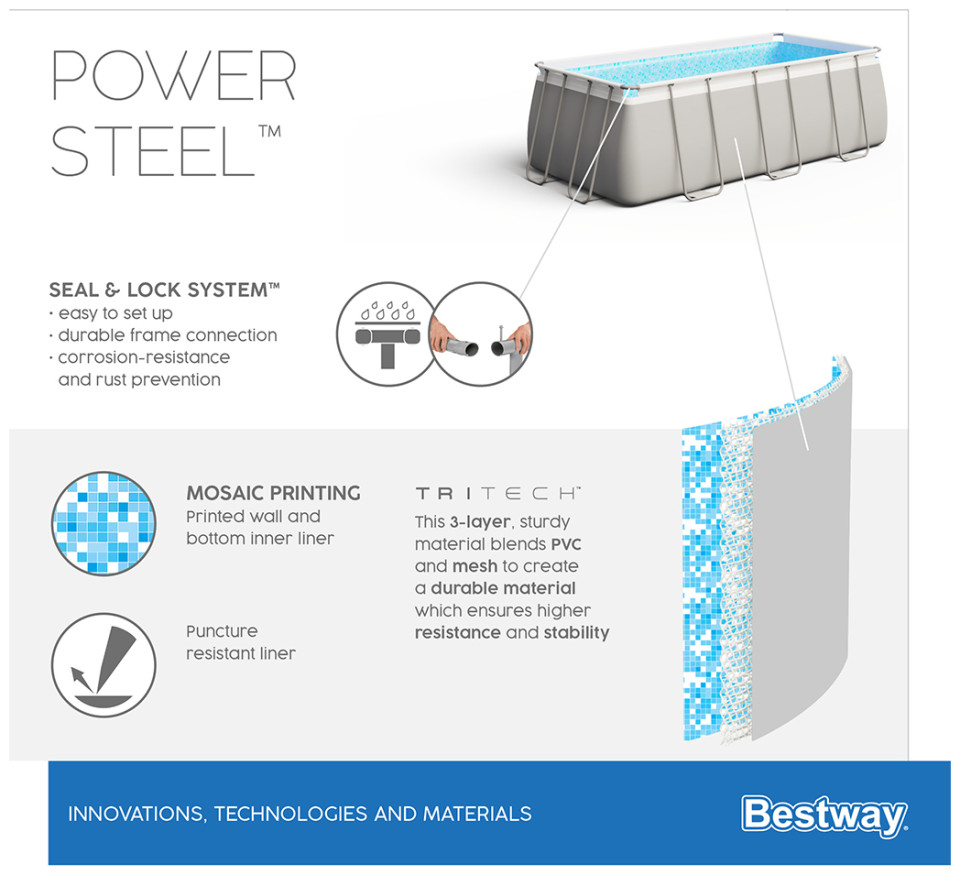 - Από υλικό TriTech™, ένα ενισχυμένο υλικό 3 στρωμάτων, με δύο στρώσεις PVC και ενδιάμεσα στρώση διχτυού polyester, το οποίο προσφέρει εξαιρετική δύναμη και αντοχή. Αυτό το ανώτερης ποιότητας υλικό μπορεί να αντέξει σε ακραίες συνθήκες, αλλά και την υπεριώδη ακτινοβολία και το χλώριο. Επίσης, έχει πιστοποιηθεί η αντοχή του στο βάρος και την πίεση που ασκεί μεγάλος όγκος νερού.