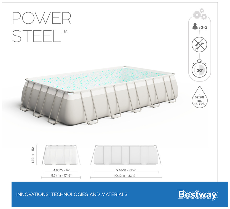 Όταν δεν μπορείτε να δροσιστείτε στην παραλία, μπορείτε στον κήπο σας! Η απίθανη πισίνα BESTWAY, με ατσάλινο εξωτερικό σκελετό, νέα ισχυρότερα οβάλ πόδια και διαστάσεις 9.56 x 4.88 x 1.32m, σας το εγγυάται! Είναι φτιαγμένη από το ανώτερης ποιότητας υλικό TriTech™, ένα ενισχυμένο υλικό 3 στρωμάτων με δύο στρώσεις PVC και μία στρώση διχτυού polyester ενδιάμεσα, που προσφέρει εξαιρετική δύναμη και στιβαρότητα, αντέχει στις ακραίες συνθήκες, την υπεριώδη ακτινοβολία και το χλώριο, και έχει πιστοποιηθεί ως προς την αντοχή του στο βάρος και την πίεση που ασκεί μεγάλος όγκος νερού και με νέο εσωτερικό με εκτύπωση τύπου μωσαϊκού! Διαθέτει βαλβίδα ελεγχόμενης ροής, για εύκολο άδειασμα, φίλτρο άμμου, αντλία φίλτρου 220V(7.571L), σκάλα, κάλυμμα και προστατευτικό εδάφους! Αναμφίβολα, μία ιδανική επιλογή για ένα δροσερό καλοκαίρι στο σπίτι σας!