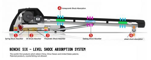 - Πατενταρισμένο αντικραδασμικό σύστημα 6 επιπέδων με ειδικούς ελαστικούς αποσβεστήρες κατά μήκος του δαπέδου και ειδικά αμορτισέρ με μπουκάλες
