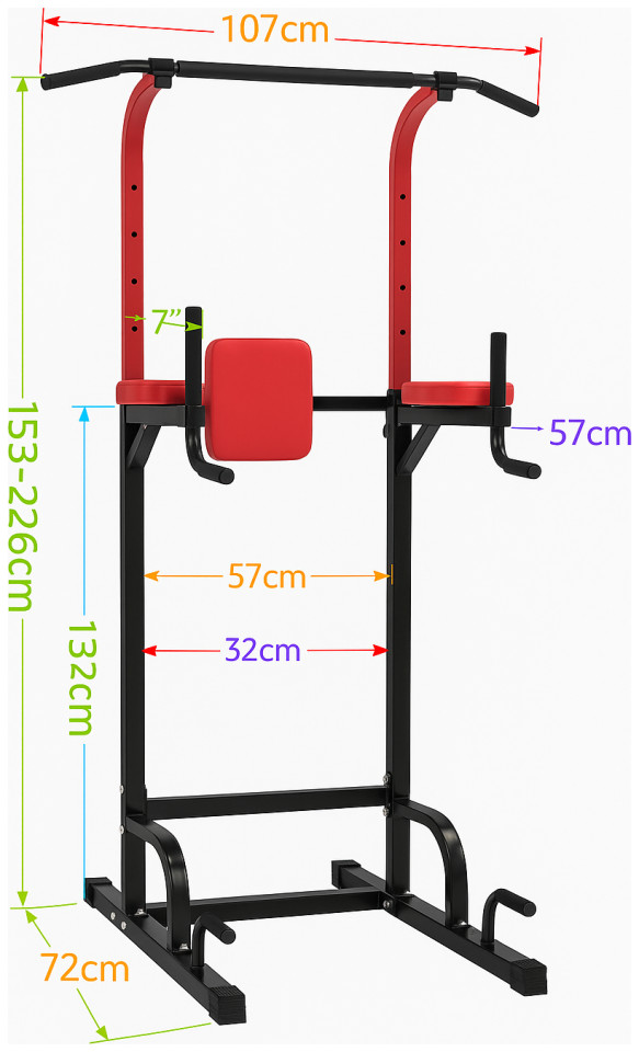 Το προϊόν διαθέτει εργονομικό σχεδιασμό που επιτρέπει την εκτέλεση ποικιλίας ασκήσεων, όπως έλξεις, βυθίσεις και κοιλιακούς, προσφέροντας πλήρη εκγύμναση του σώματος. Η κατασκευή του από υψηλής ποιότητας υλικά εξασφαλίζει μακροχρόνια χρήση χωρίς φθορές.
