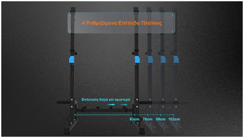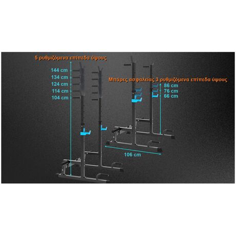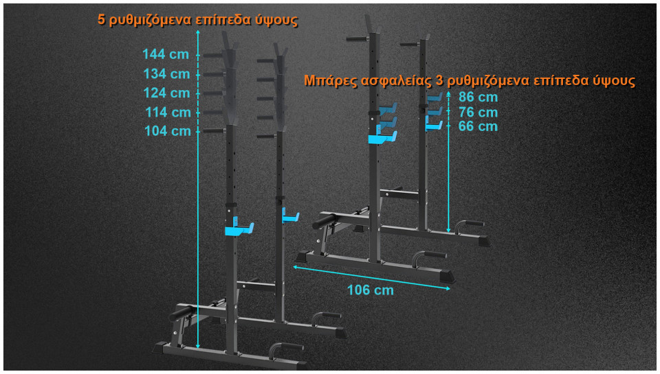 • Τοποθέτηση μπάρας: Σε 5 θέσεις (Μεταξύ 104 - 144 cm)