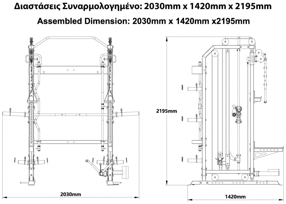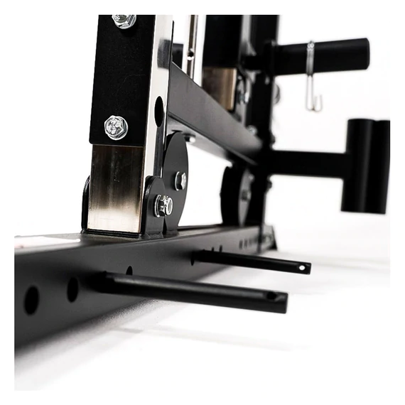 - Μηχανισμός με κυλίνδρους και τετραγωνικά ρουλεμάν, με ράγες υψηλής ποιότητας που παρέχουν εξαιρετικά ομαλή κίνηση. Εύκολο σύστημα κλειδώματος και απελευθέρωσης βελτιώνει την ασφάλεια και σας βοηθάει να ασκήστε χωρίς βοηθό. Στην μπάρα του συστήματος μπορείτε να προσθέσετε το προσάρτημα πίεσης ποδιών για να μετατρέψετε τη μηχανή smith σε κάθετη πρέσα ποδιών.