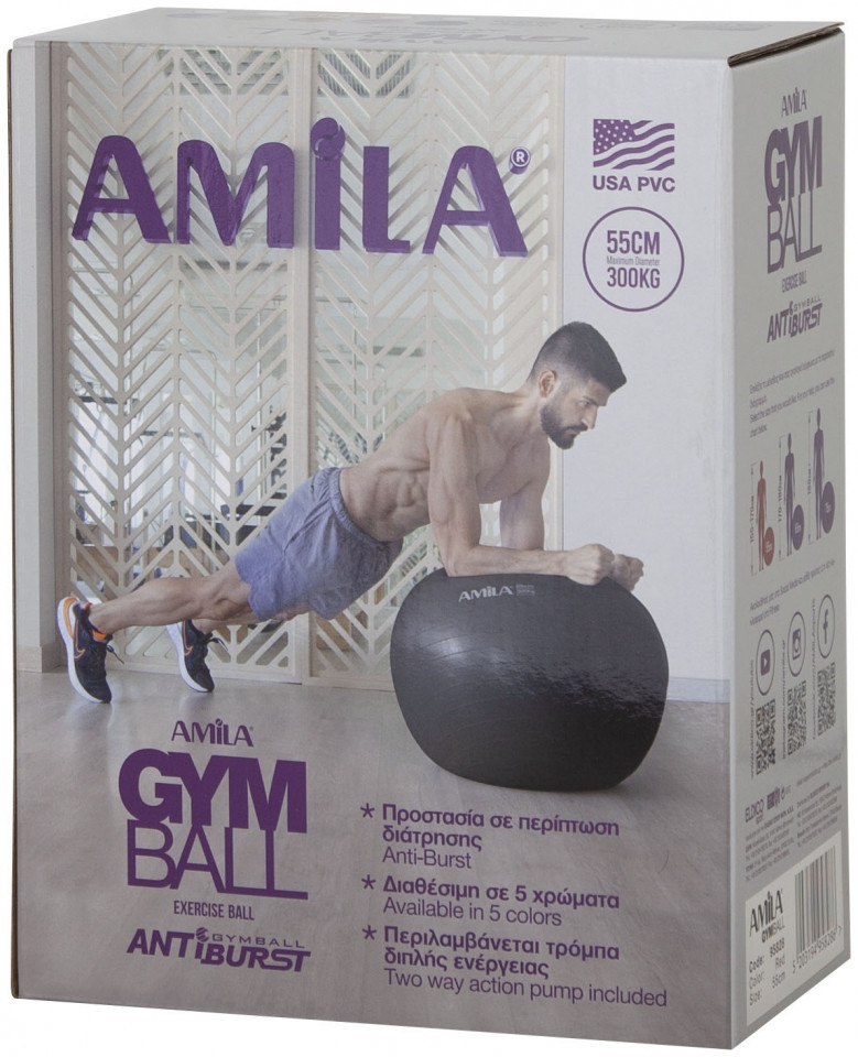Η μπάλα 48438 της εταιρείας Amila, σας βοηθά να γυμνάσετε γλουτούς, κοιλιακούς και να ηρεμήσετε από τους πόνους της εγκυμοσύνης. Μπορεί επίσης να χρησιμοποιηθεί σαν σκαμπό βοηθώντας να βελτιώσετε την στάση του σώματος, την κυκλοφορία του αίματος και να μειώσετε τους πόνους στην μέση. Γυμνάστε τα πόδια σας με ασκήσεις απαγωγών, ενδυναμώστε τους κοιλιακούς με Ball Crunches καθώς και τους δικέφαλους και τετρακέφαλους με έλξεις, σμιλεύστε το στήθος σας με incline presser και ''χτίστε'' την πλάτη σας με κωπηλατική και bridges, μόνο με την ασφάλεια και την ποιότητα της εταιρείας Amila!